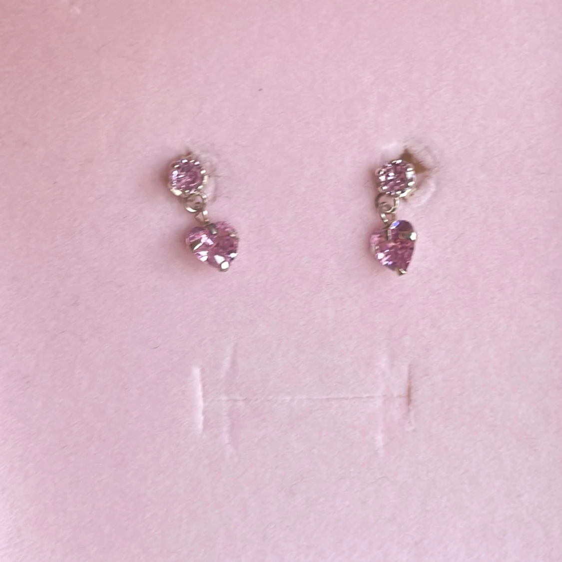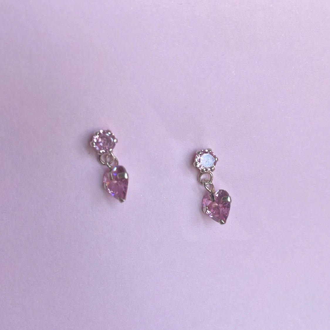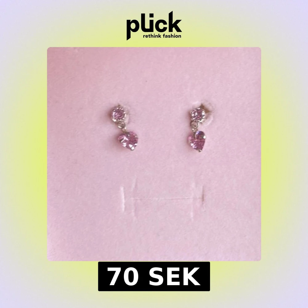 Ett par små örhängen med glittrande rosa stenar. Örhängena har en rund sten upptill och ett hängande hjärta i rosa nedtill. Perfekta för att addera lite färg och sötma till din stil.