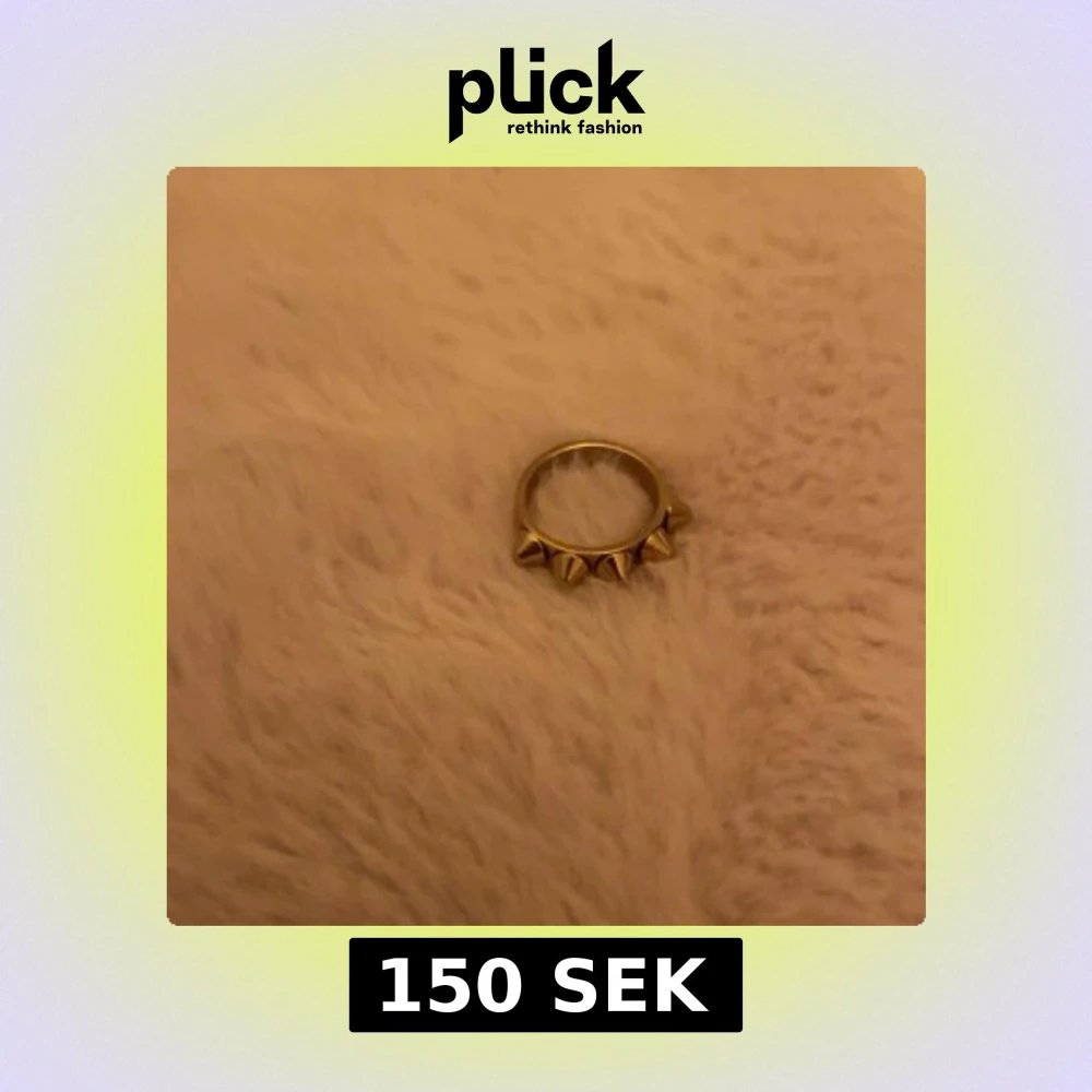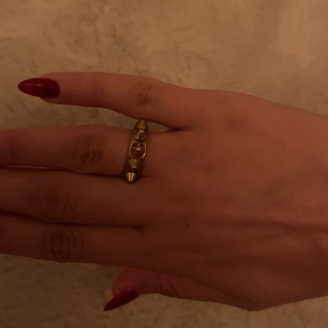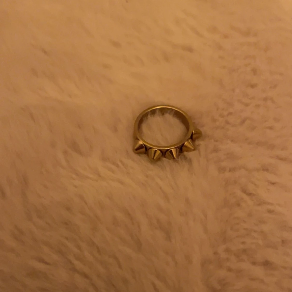 Cool ring i guldfärg med fyra spetsiga nitar runt om. Perfekt accessoar för dig som gillar edgy och unik stil. Ringen har en rund form och är enkel att matcha med andra smycken.