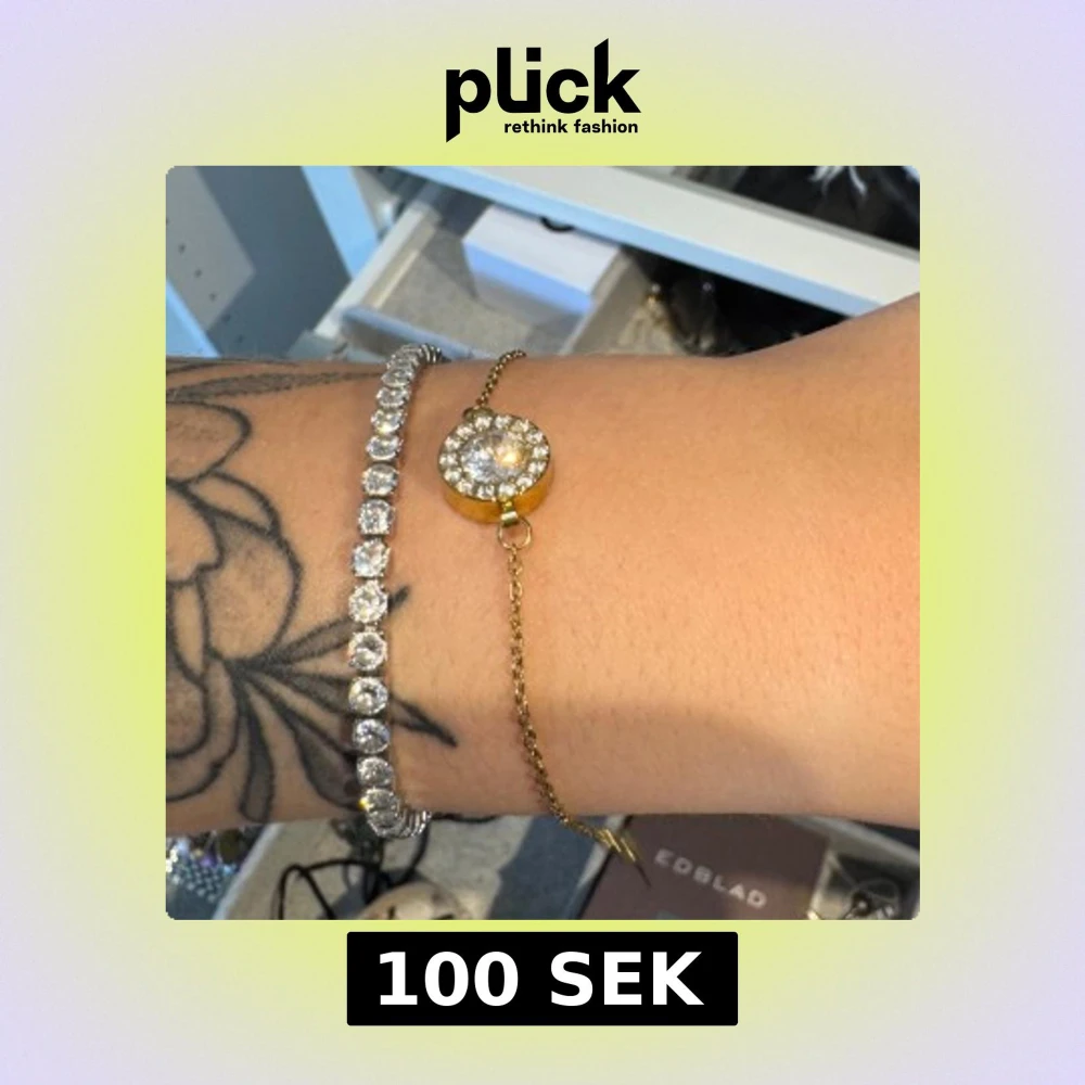 Säljer ett elegant armband i guldfärg med en rund, glittrig detalj i mitten täckt av klara stenar. Tunt kedjearmband som passar perfekt för att addera lite extra bling till din stil.