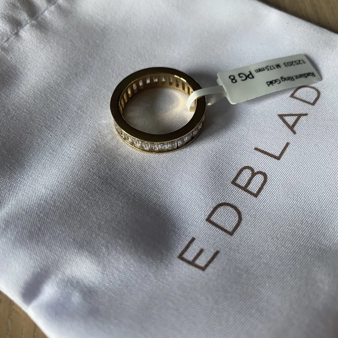 Edblad Radiant Ring Gold. 14 karat guldpläterat ring. Helt oanvänd. Lappen sitter kvar på och dustbagen finns kvar. Köptes för ca en månad sedan men inte använts. Storlek 8 (17,5 mm) Nypris 499 kr