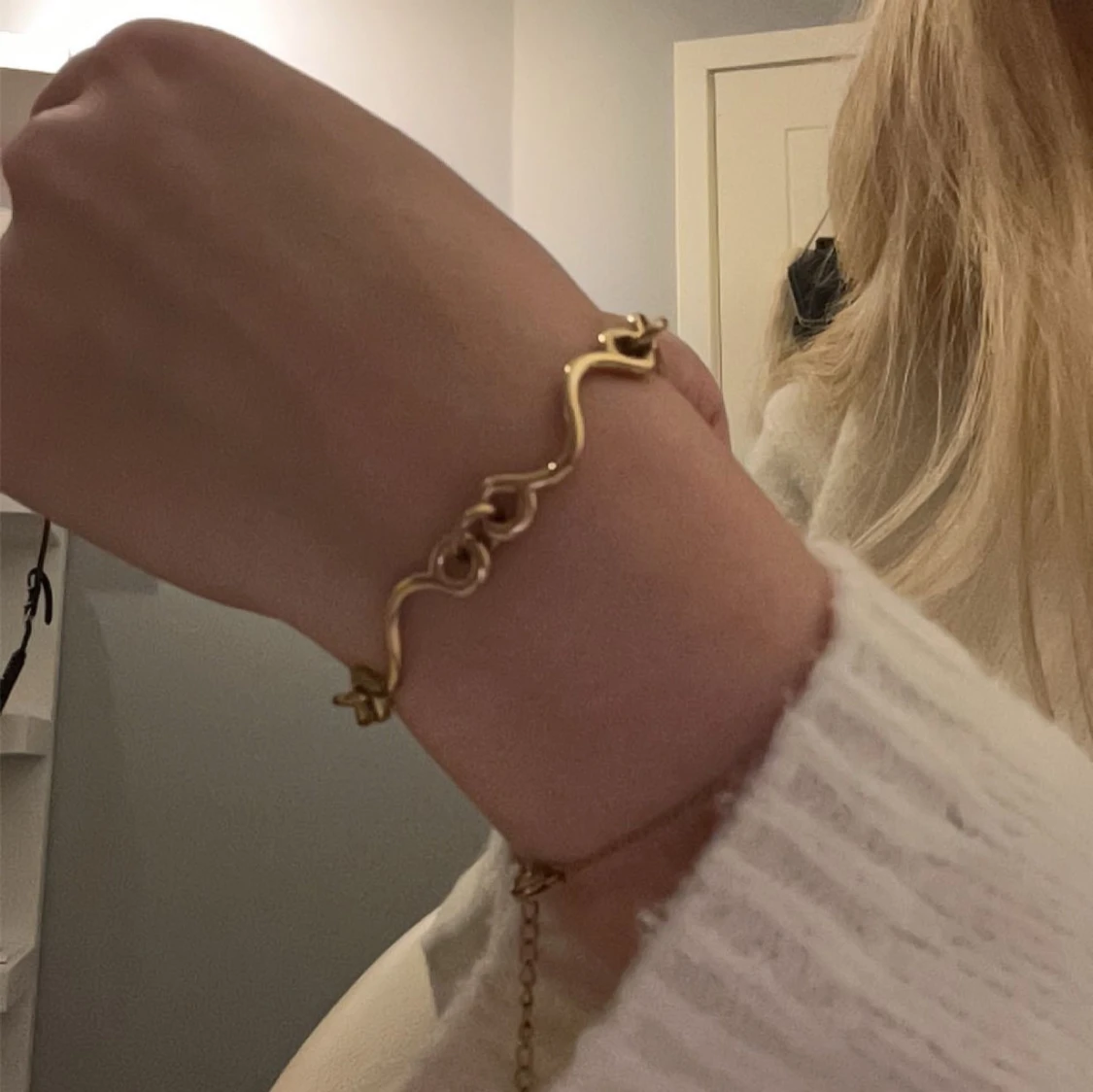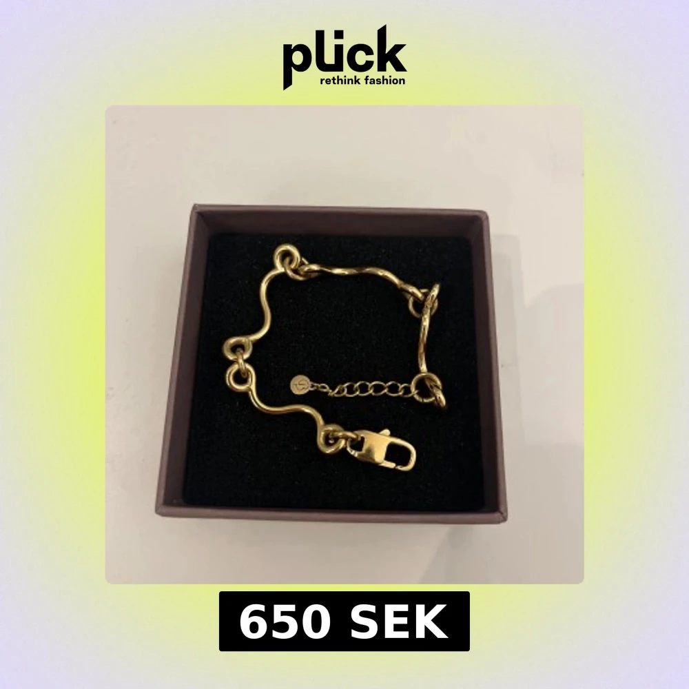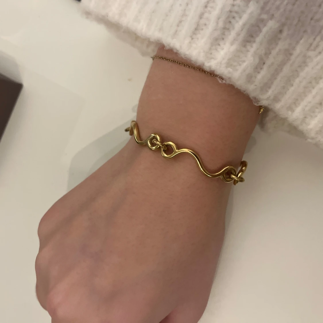 Jag säljer det här eleganta guldarmbandet med unik vågig design. Armbandet har en justerbar kedja och ett stilrent lås. Perfekt för att ge en touch av lyx till din outfit. Helt oanvänd förutom vid bilden då.