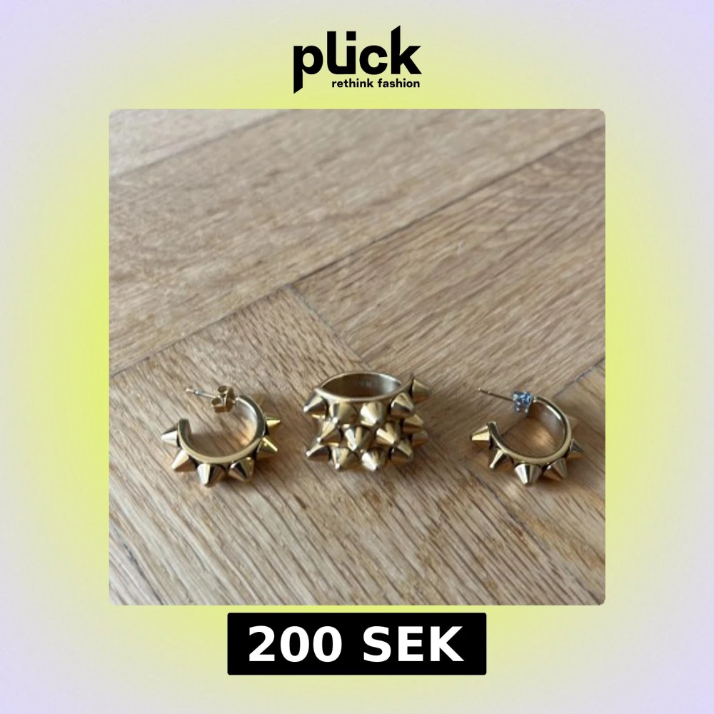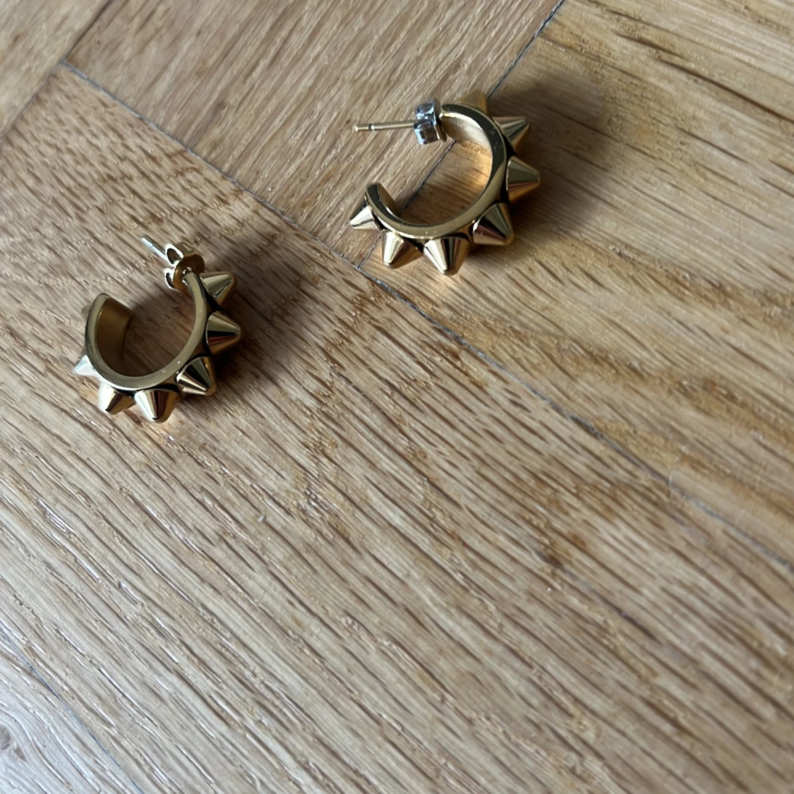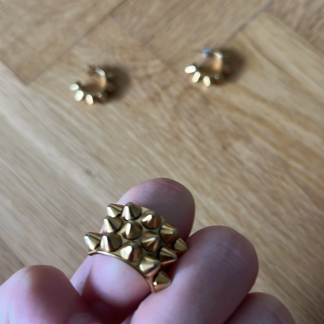 Säljer ett set med chunky guldfärgade smycken: ett par örhängen och en ring, alla dekorerade med coola konformade nitar. Ger en edgy vibe och sticker verkligen ut. Perfekt för dig som gillar statement-accessoarer.