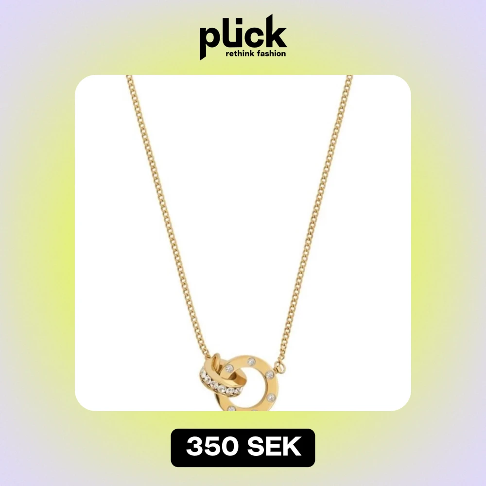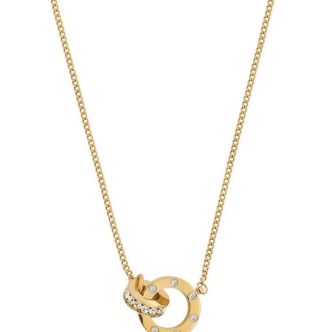 Säljer ett elegant guldhalsband med en unik cirkelformad hängsmycke dekorerad med gnistrande kristaller. Perfekt för att ge en touch av glamour till vilken outfit som helst. Kedjan är fin och smidig, vilket gör den bekväm att bära hela dagen. Helt oanvänd