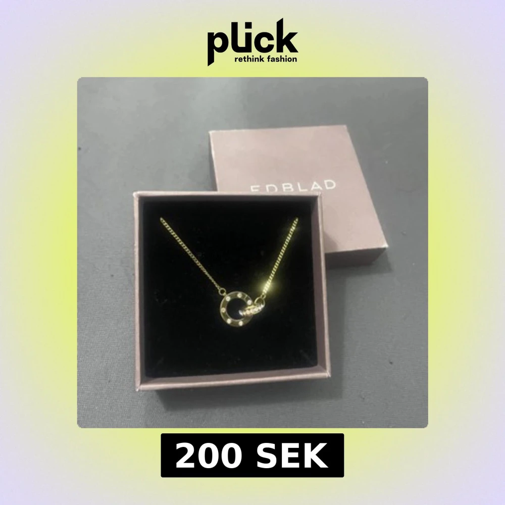 Snyggt halsband från Edblad i guldton med en rund cirkelberlock dekorerad med små gnistrande stenar. Kedjan är tunn och elegant, perfekt för att lyfta vilken outfit som helst. Kommer i originalask.