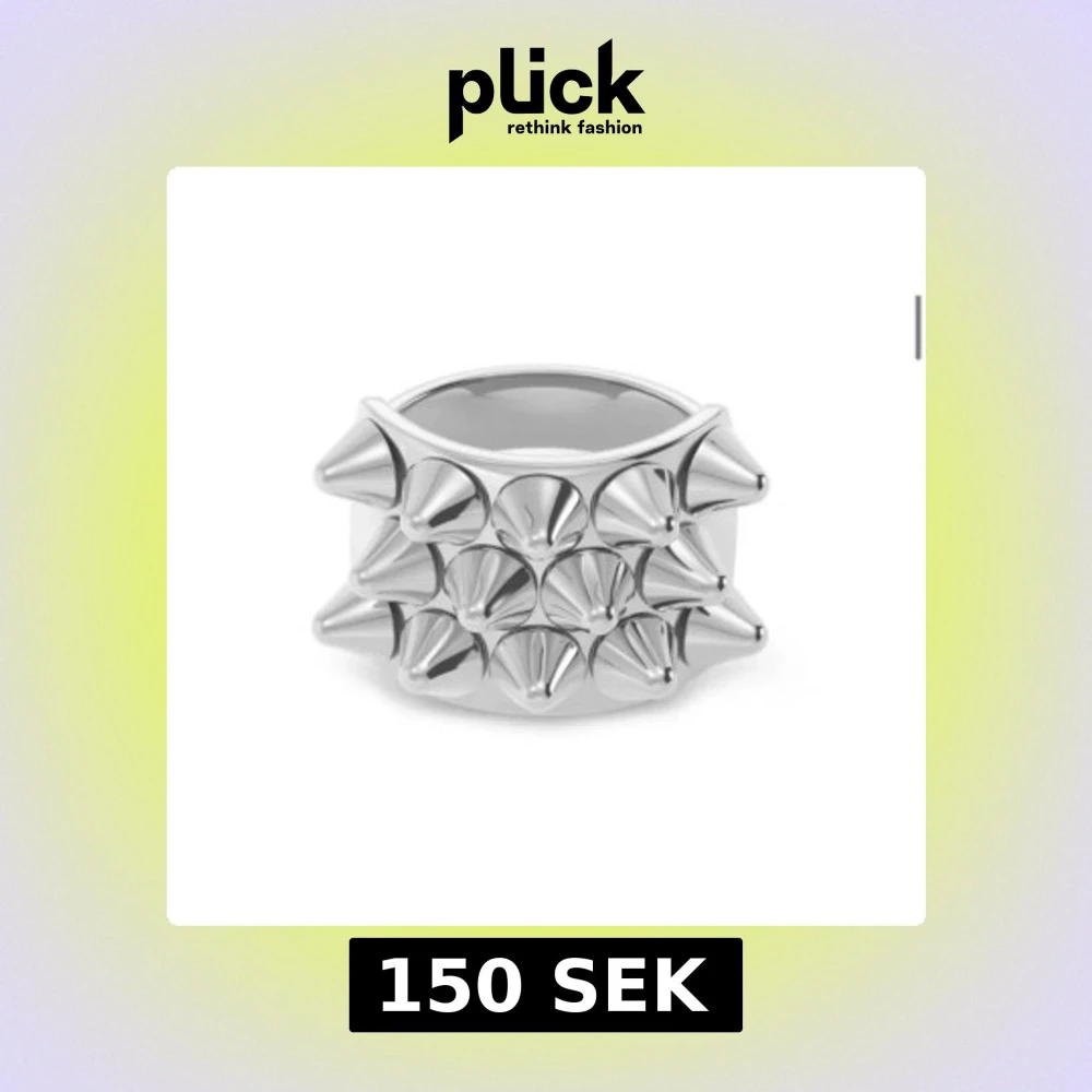 Silvrig ring med nitar - Cool och chunky ring i silverfärgad metall med tre rader av spetsiga nitar framtill. Ringen har en bred design som verkligen sticker ut och ger en edgy vibe till din stil. Perfekt för dig som gillar statement-smycken och vill ha något unikt. Väldigt bra skick! Helt ny❤️