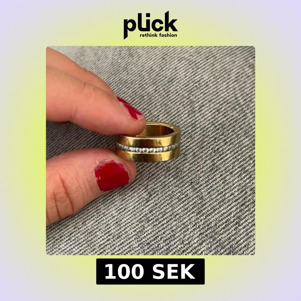 Säljer en bred ring i guldfärg med en rad små stenar i mitten, troligen i storlek M. Ringen har en modern och stilren design, den guldiga färgen har hållit bra och finns endast täcken på slitage på utsidan av ringen, främst i kanterna