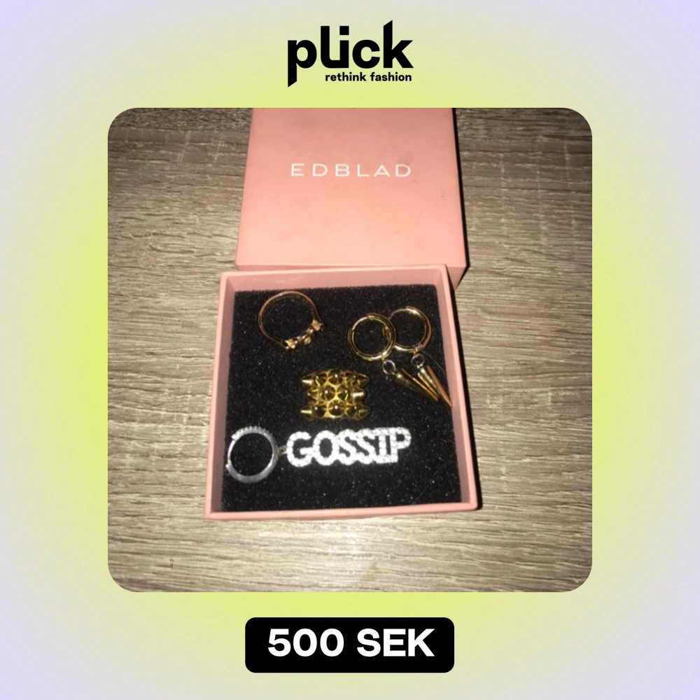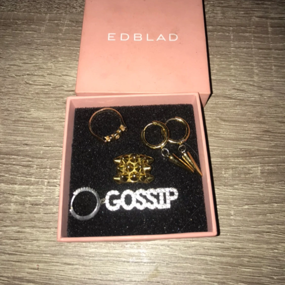 Säljer ett coolt smyckeset från Edblad. Setet innehåller flera ringar i guld och silver, inklusive en med texten 'GOSSIP'. Perfekt för att ge din outfit en edgy touch. Kommer i en snygg rosa ask.