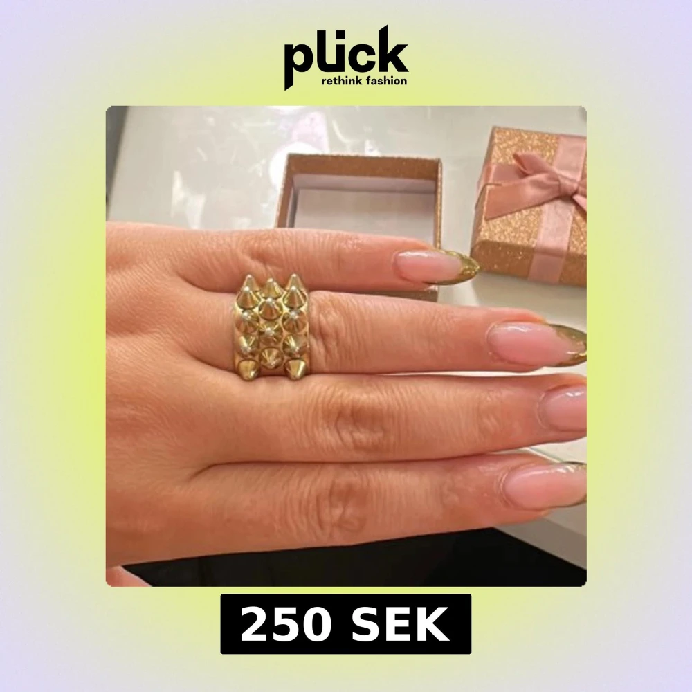 Snygg och unik guldfärgad ring med flera små nitar i ett geometriskt mönster. Perfekt för att ge en edgy touch till din stil. Kommer i en fin presentask. den är 16.00 mm🩷