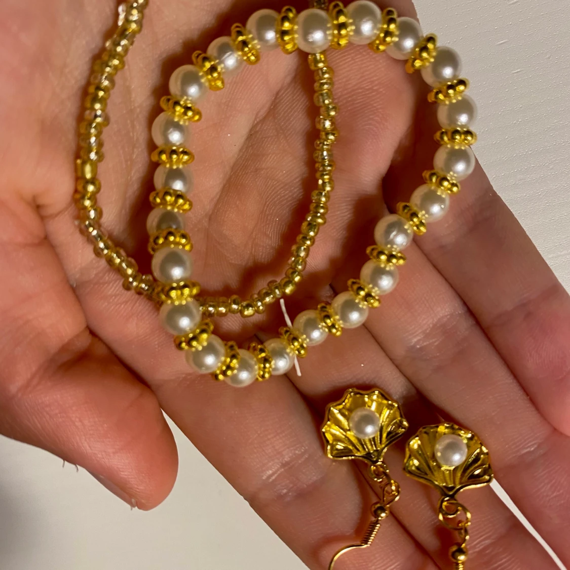 En fin guldkollektion som bestĂ„r av ett par fina snĂ€ckörhĂ€ngen, ett guldarmband med vita pĂ€rlor och ett matchande armband till. Smyckena kan köpas var och för sig eller tillsammans! Alla tillsammans kostar endast 35 kr + 12 kr frakt! Bara örhĂ€ngena kostar 15 kr, och det vita och guldiga 20 kr och det sista 10 kr!Skriv privat vid intresseđâïž