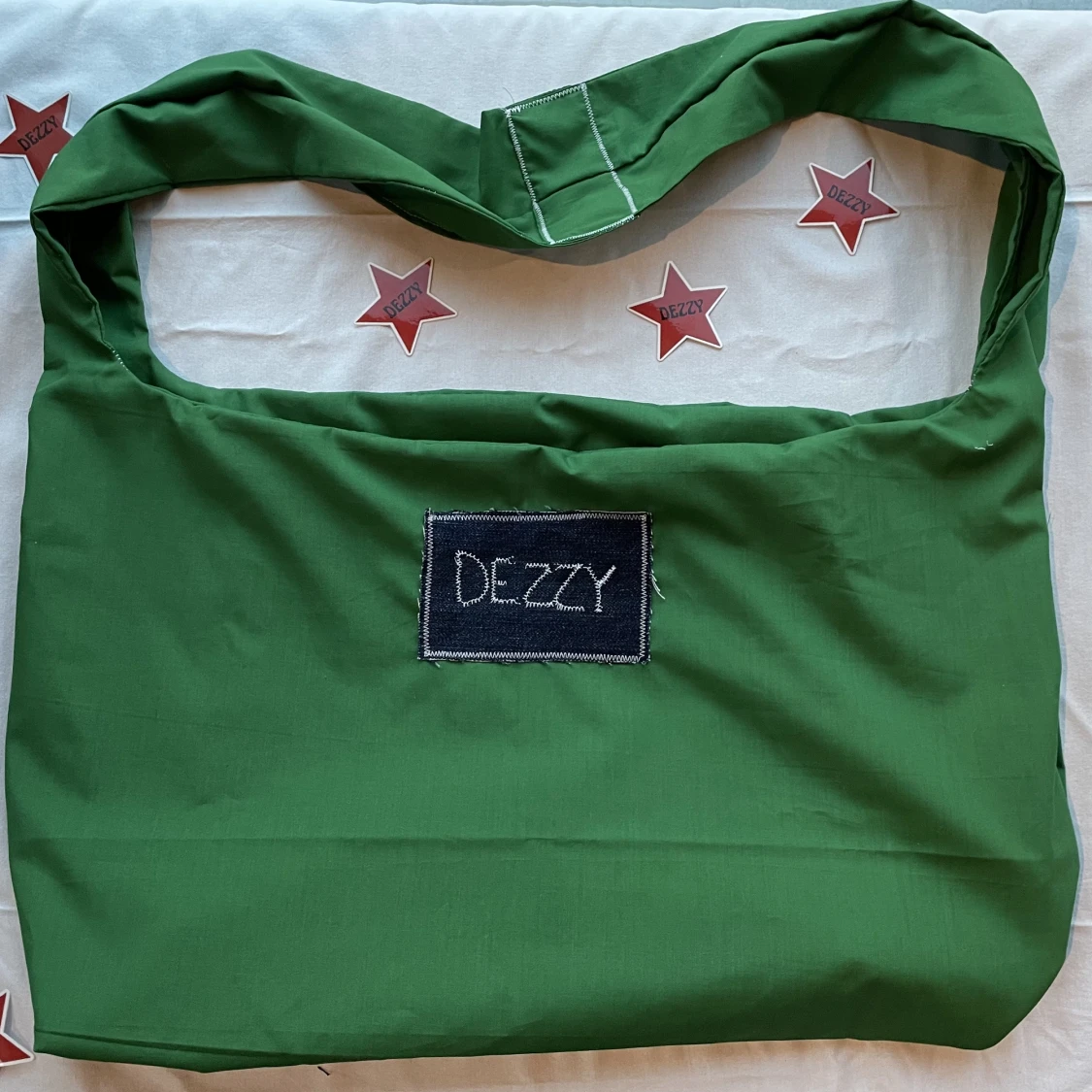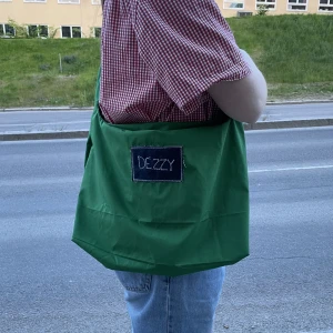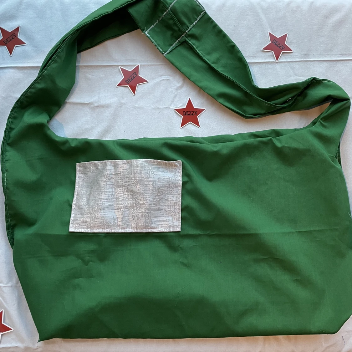 En handsydd väska gjord av återanvänt segondhand-tyg med fickor av Lars Wallin tyg❤️