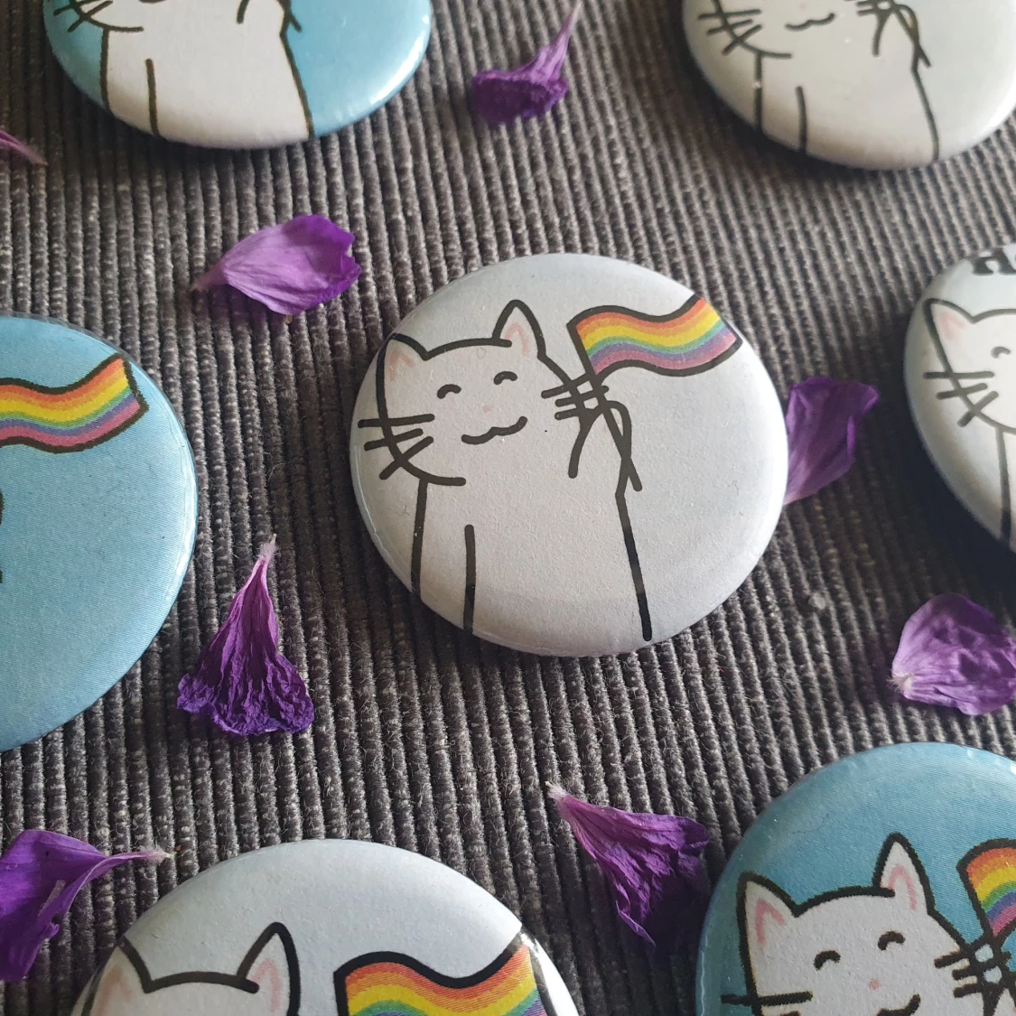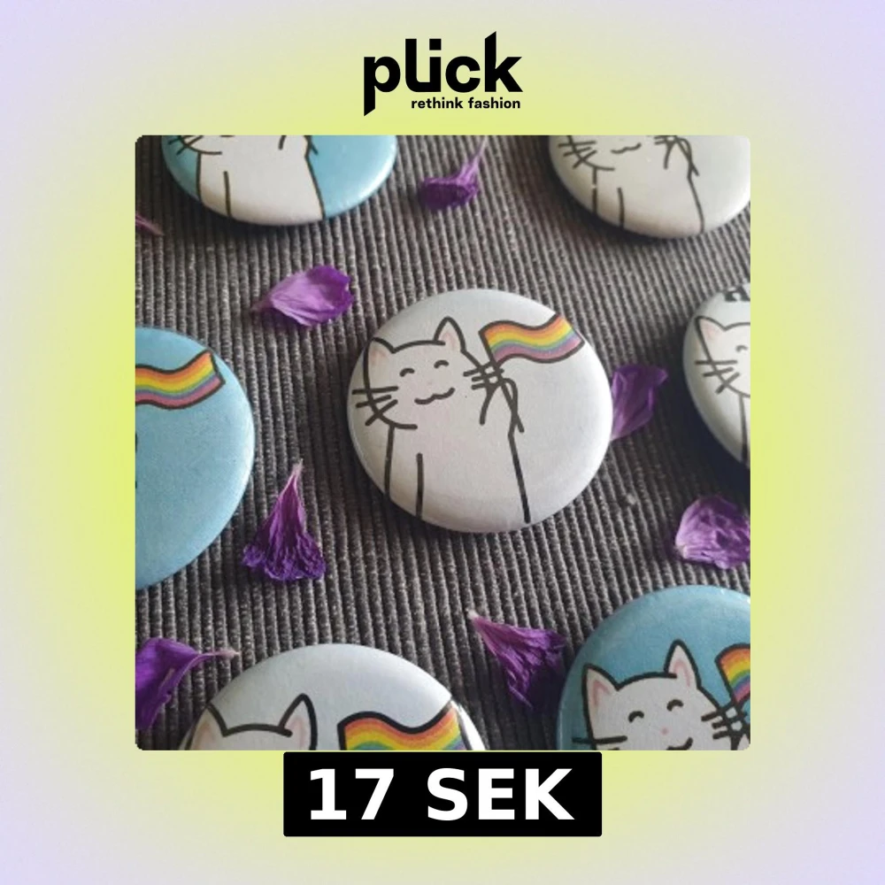 🐱Pins/knappar med en vit katt och en prideflagga på 🏳️🌈 Finns med blå bakgrund och vit bakgrund. Detta är första sorteringen, alltså är dessa i mycket bra skick. Det finns andra sorteringens också, och de är billigare men också sämre kvalitet. 🗣️ Det finns många utan text men även några få som det står “Heja!“ på. ✨Jag har både designat och tillverkat dem själv!