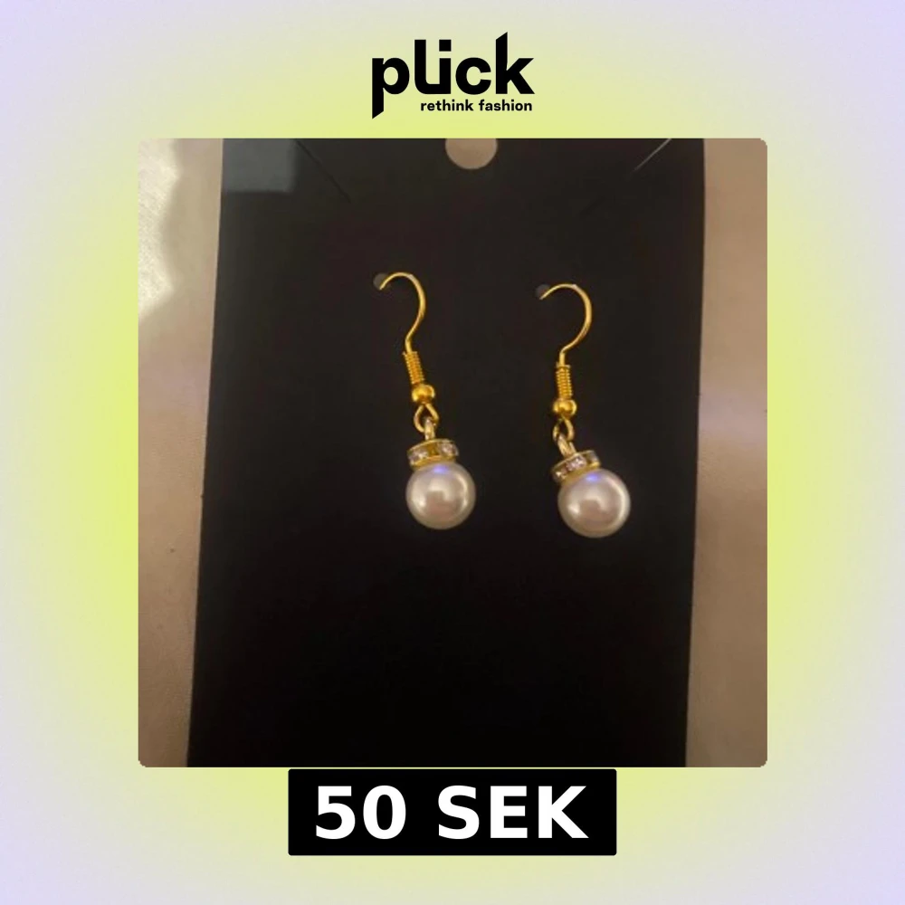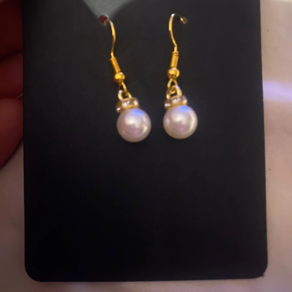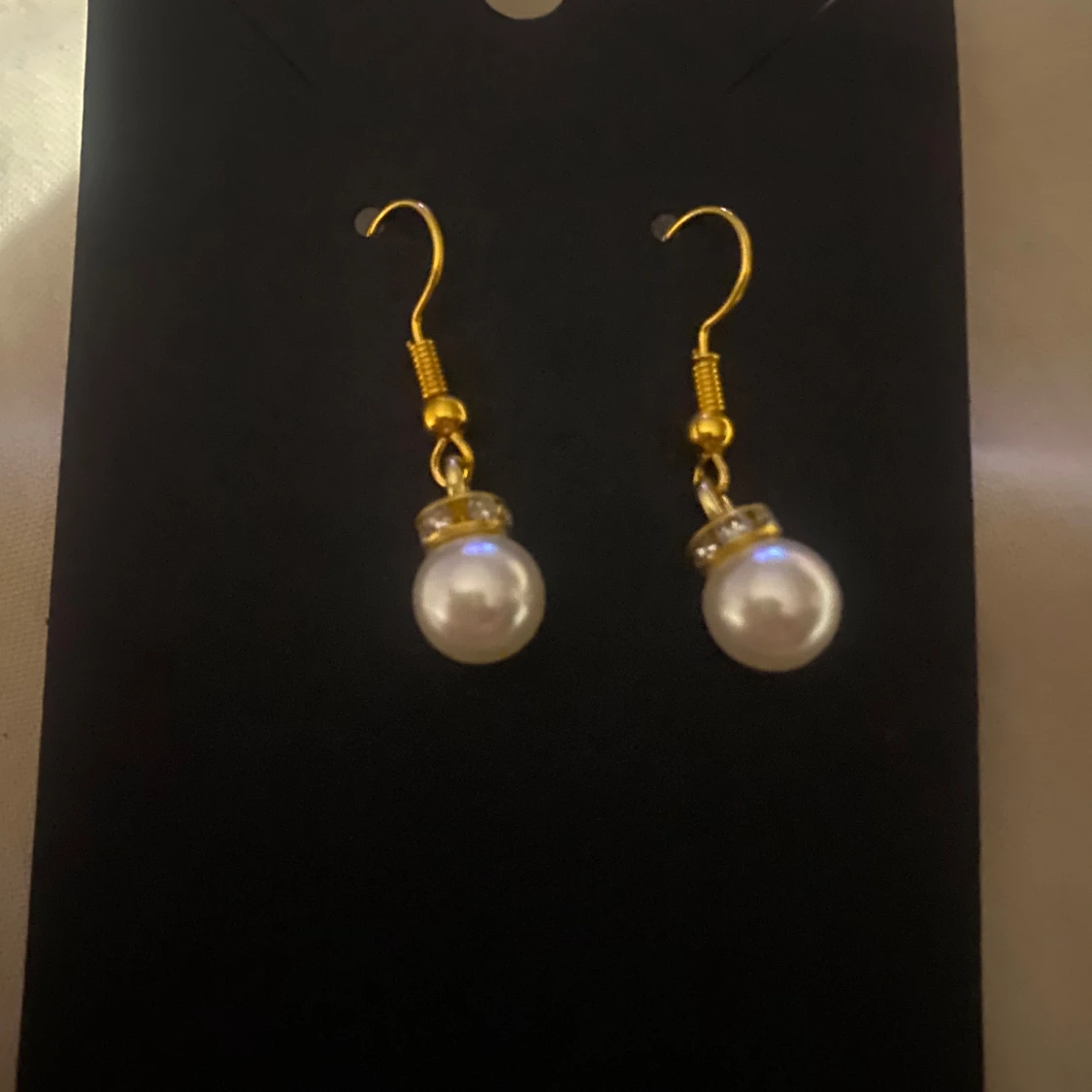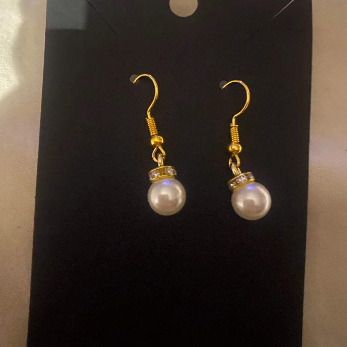 Egengjorda örhängen med guldfärgade krokar och vita pärlor. Perfekta för att ge en klassisk touch till din stil. Pärlorna är fästa med en liten guldfärgad detalj som ger extra glans.