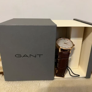 Snygg damklocka från GANT med brun läderrem och vit urtavla. Klockan har en stilren design med guldfärgad boett och tydliga markeringar. Perfekt för den som vill ha en klassisk och tidlös accessoar. Helt ny med plast och allting på! Nypriset är runt 1650kr.