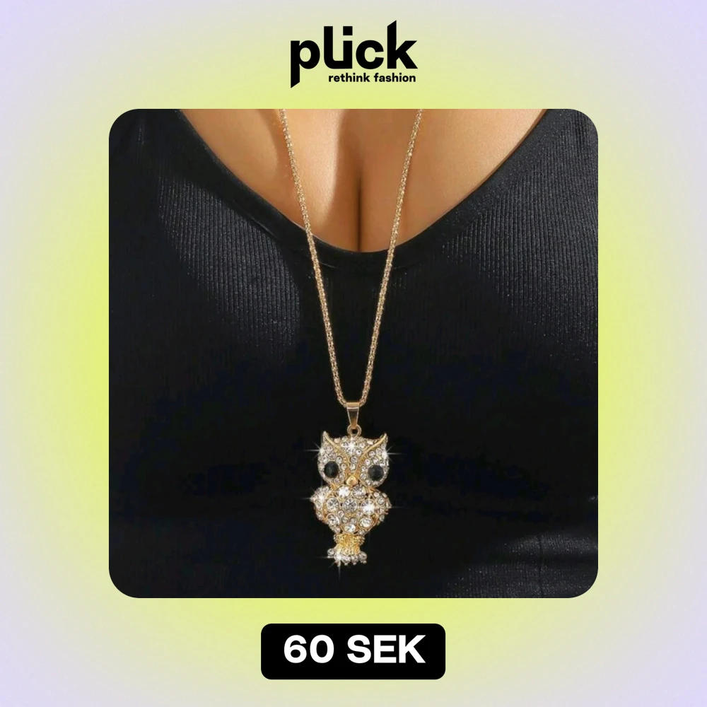 Säljer ett supercoolt guldigt halsband med en glittrig uggla som hänge. Kedjan är 76 cm lång och ugglan är täckt med gnistrande stenar som verkligen fångar ljuset. Perfekt för att ge din outfit en unik touch! 🦉✨