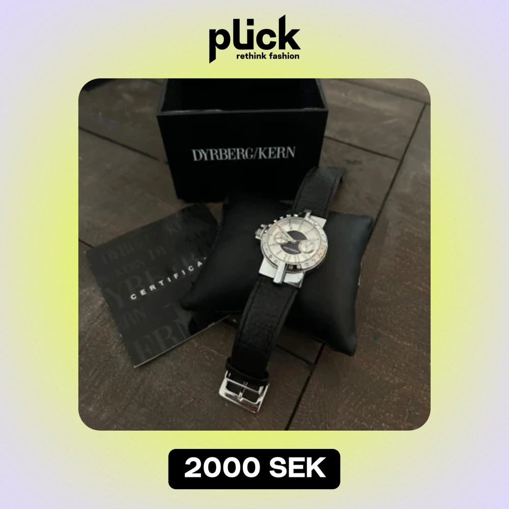 Säljer en superfin klocka från Dyrberg/Kern. Den har en stilren design med en svart läderrem och ett silverfärgat urverk. Urtavlan är dekorerad med glittriga stenar runt kanten och har en unik design med två mindre urtavlor inuti. Perfekt för både vardag och fest! Kommer med originalförpackning och certifikat.