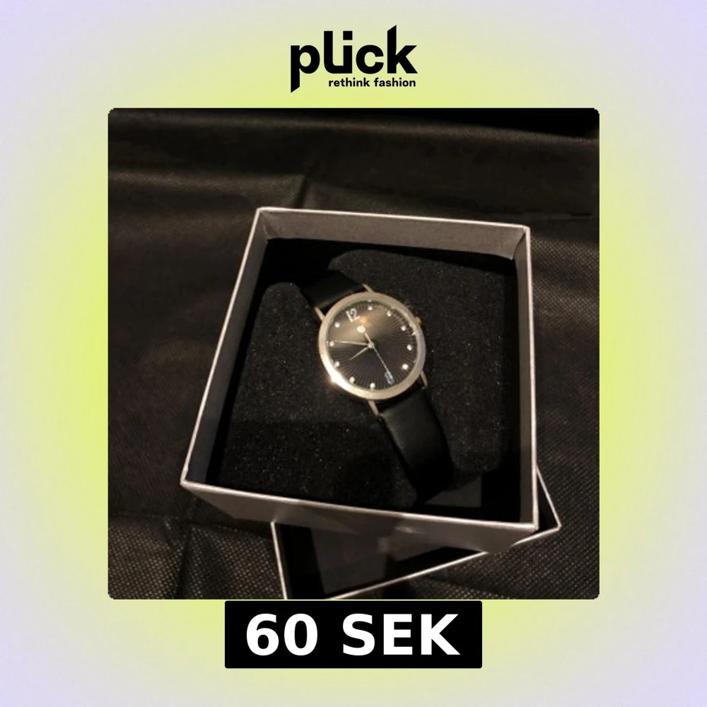 Stilren klocka med svart urtavla och silverdetaljer. Den har ett svart läderarmband och levereras i en elegant förpackning. Perfekt för en tidlös look. Nytt batteri behövs!