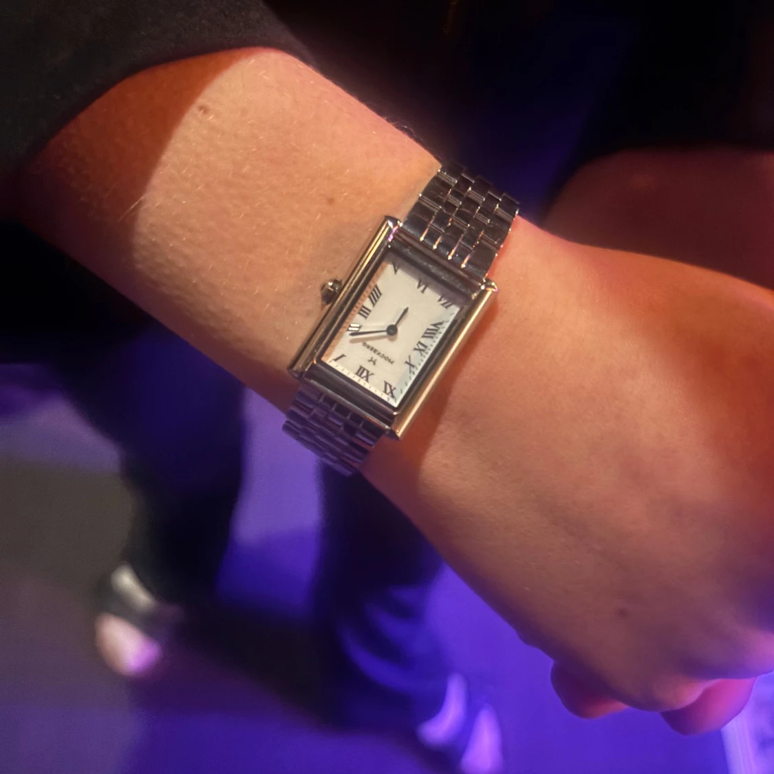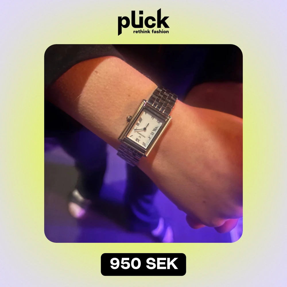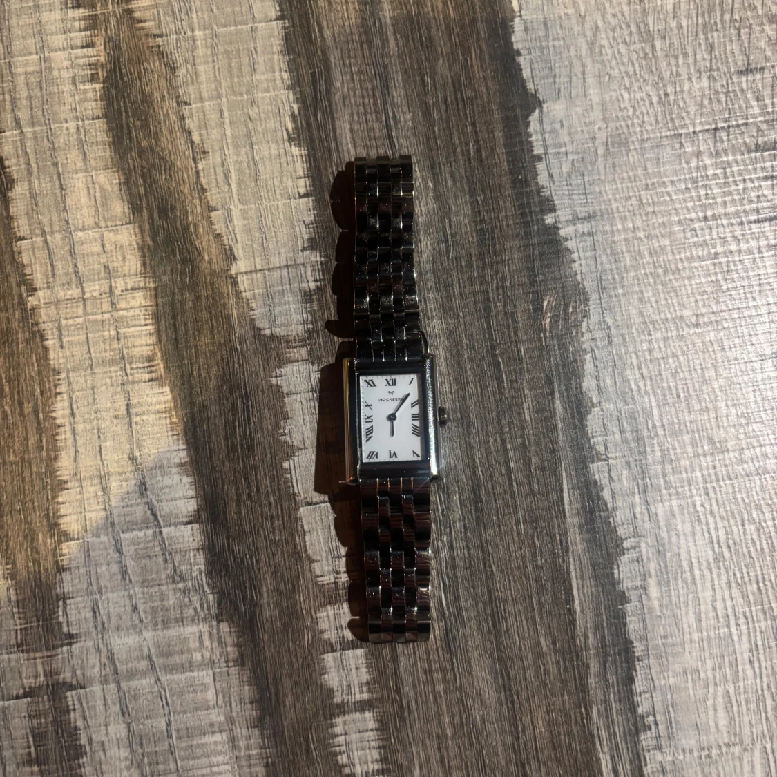 Säljer en stilren klocka i mycket bra skick. Den har en rektangulär vit urtavla med romerska siffror och en silverfärgad länkarmband. Perfekt för både vardag och fest! Är från Mockberg