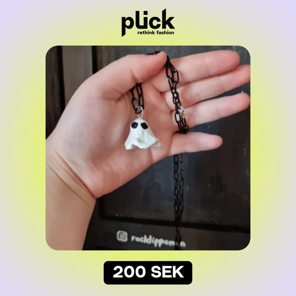 Handgjort halsband i formen av ett spöke. Skulpterade av självtorkande lera som lackats för bästa hållbarhet. Varje spöke är handgjort och därför unikt. Vid köp skickar jag även med stickers som jag designat