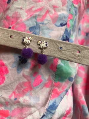 Det är enhörnings örhängen i silver🦄. Örhängena har aldrig används dom är nickelfria. Örhängerna är enhörningar nedan för på örhänget hänger en mjuk lila boll🦄💜