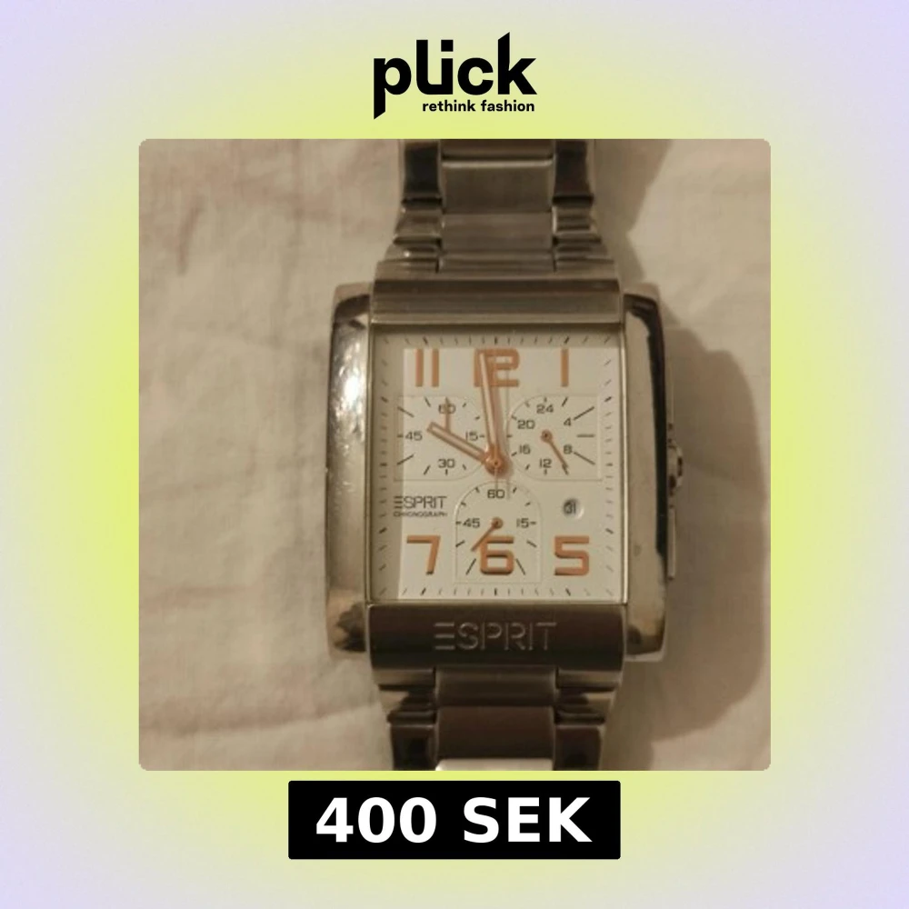 Stilren klocka från Esprit med fyrkantig vit urtavla, stora siffror i guld och kronograf-funktion. Armbandet är i blankt silverfärgat metall och har Esprit-logga både på spännet och urtavlan. Perfekt accessoar för dig som gillar klassisk design. Behövs byta batteri