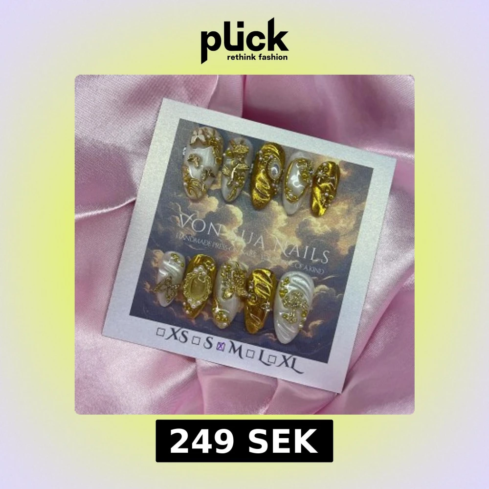 Handgjorda press-on naglar i en medium mandelform med skimrande pärlemorvit och metallic guld. Dekorerade med 3D-detaljer, pärlor och guldfärgade ornament. Snyggt barock-inspirerat mönster som verkligen sticker ut. Perfekt för dig som vill ha unika och glamorösa naglar. I storlek M: 16 mm, 12 mm, 12,5 mm, 11,5 mm, 10 mm