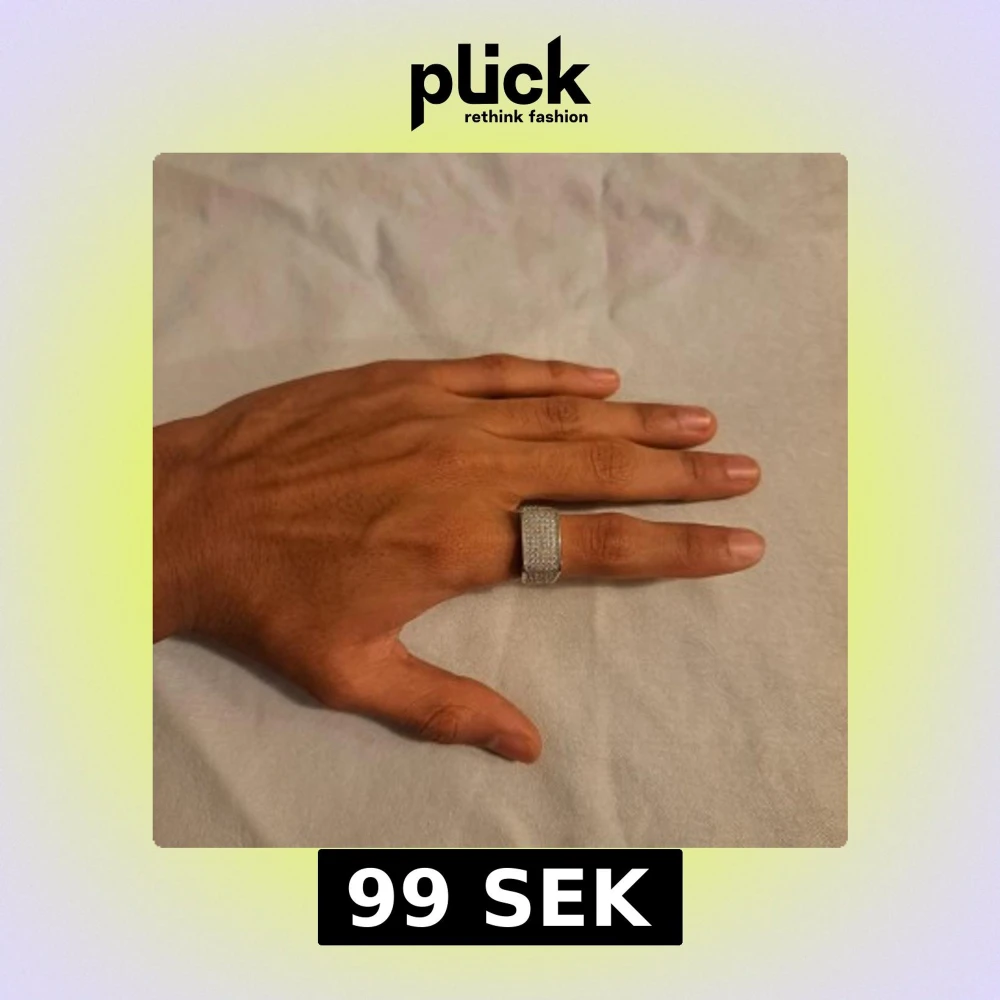 Säljer en bred och fyrkantig silverring med glittriga stenar över hela ovansidan. Ringen har en modern och chunky design som verkligen syns på handen. Perfekt för dig som gillar att sticka ut med dina accessoarer. Storlek: 54 mm | US 7