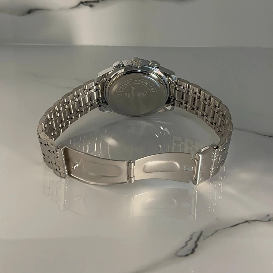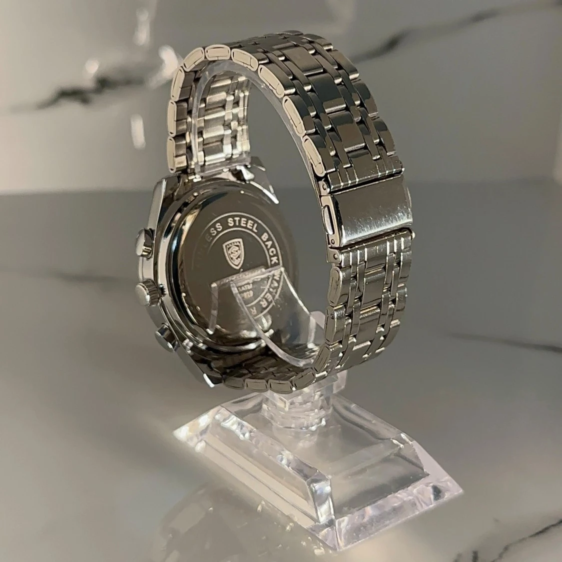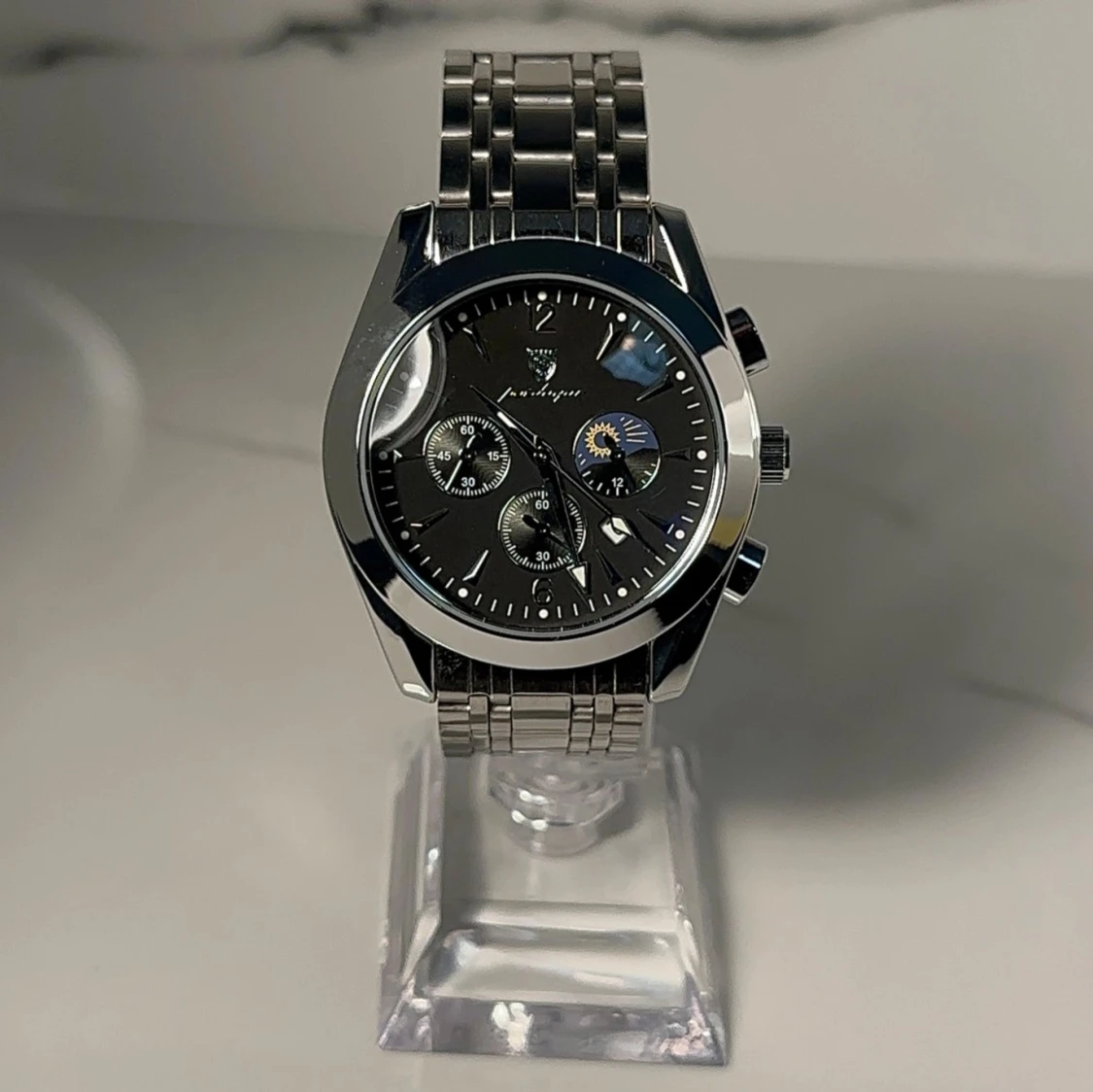 Stilren herrklocka med SVART urtavla, silverfärgat armband i rostfritt stål och flera små urtavlor. Klockan har en klassisk rund form och metallänk som ger en elegant look. BOX, ALLA LÄNKAR och LÄNKJUSTERARE MEDFÖLJER! PRISET KAN DISKUTERAS VID SNABB AFFÄR!