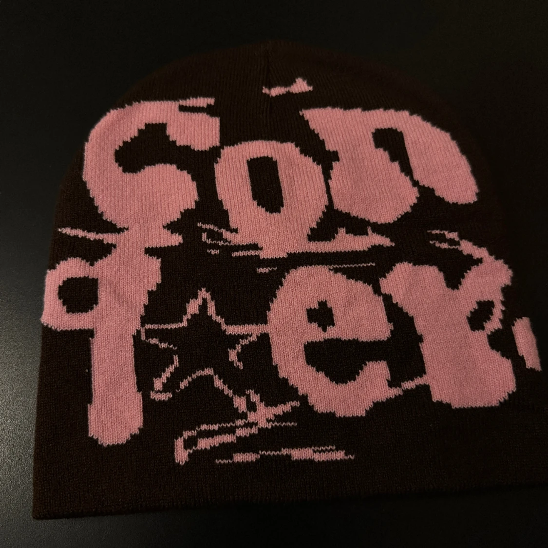 Skön one size fits all beanie. Stjärn-motiv, riktigt skön kvalitet. Drain emo opium y2k vintage stilen brun beige ljusrosa färg