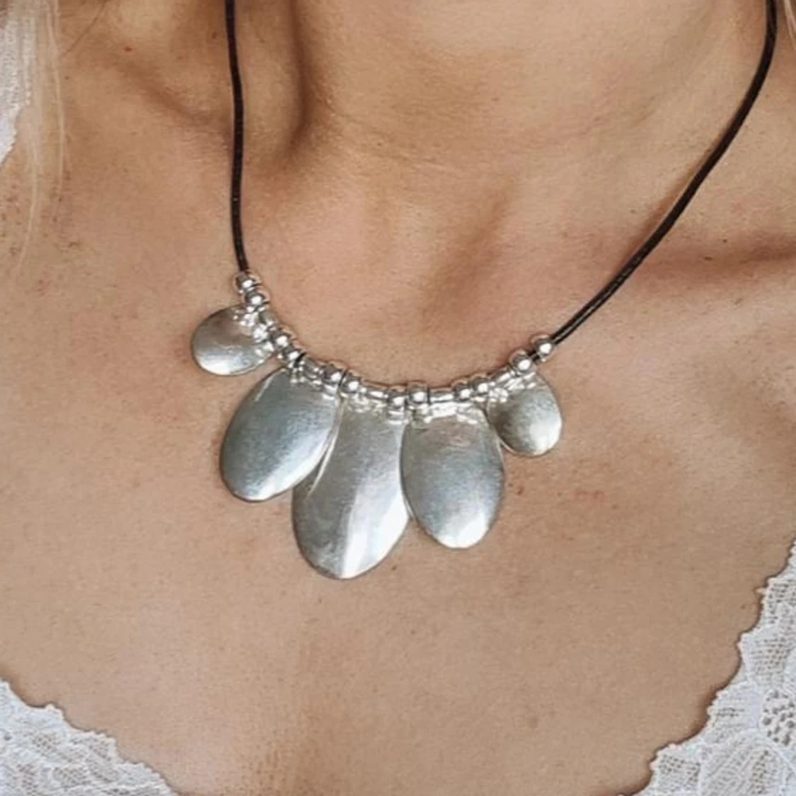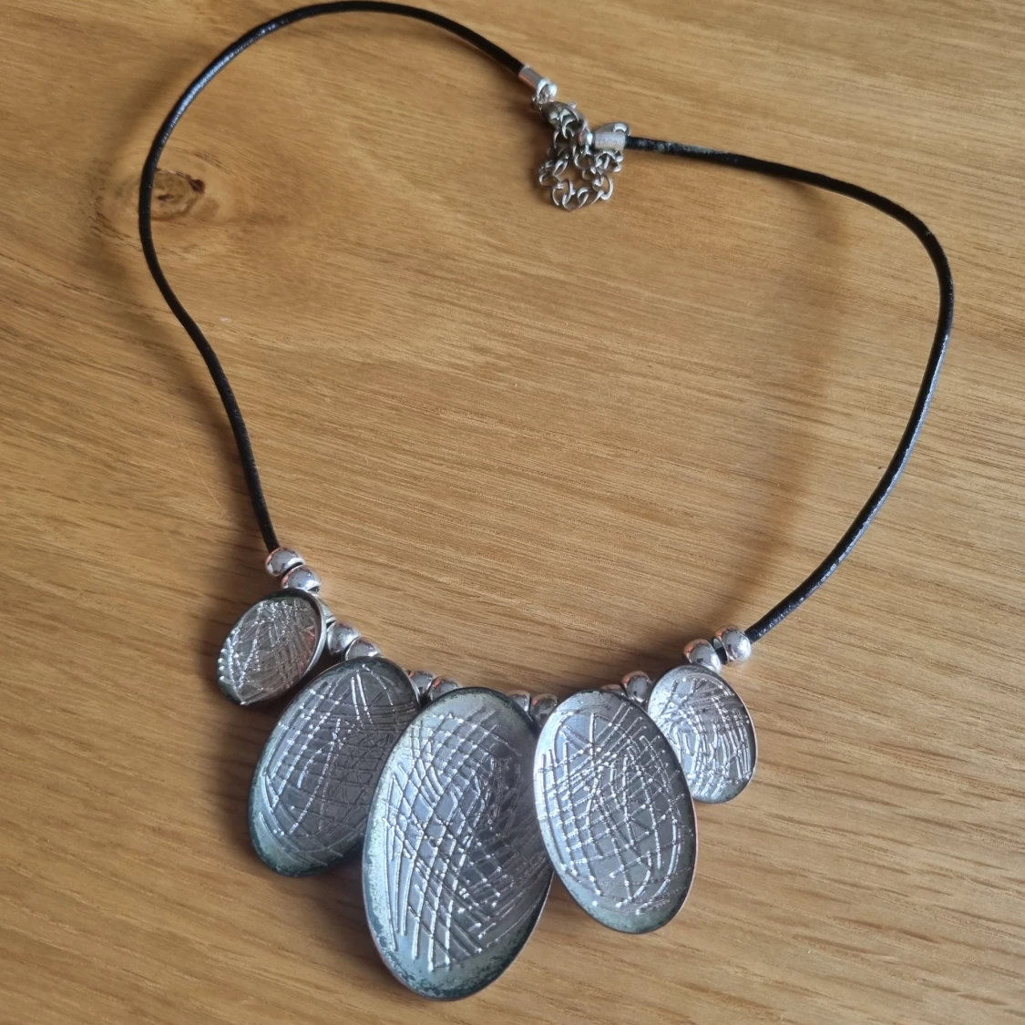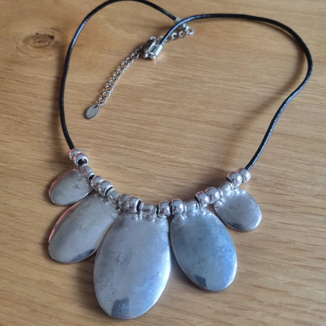 Svart kedja i textil / skinnimitation med silvriga hängen. Lite tecken på slitage
