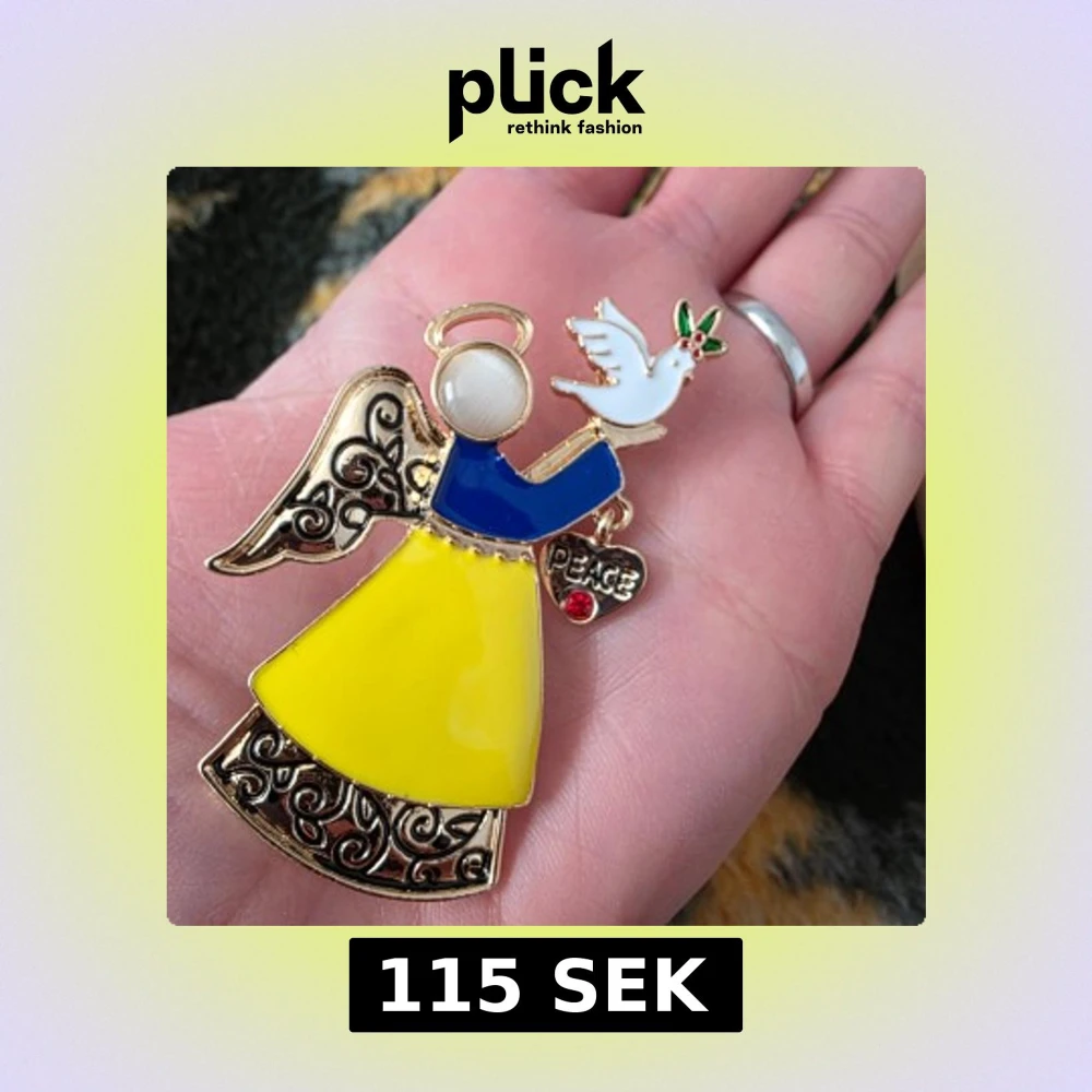 Charmig brosch i form av en ängel med en fredsduva. Ängeln har en gul kjol, blå topp och detaljer i guld. Den håller en skylt med texten 'Peace'. Perfekt som en symbol för fred och kärlek.