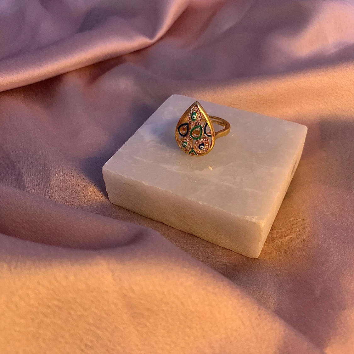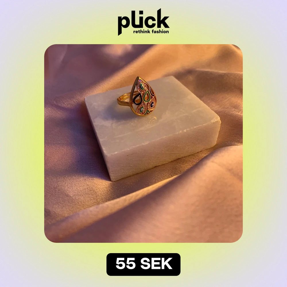 Säljer en unik och färgglad ring med en droppformad design. Ringen har ett vackert mönster med olika färger som blått, grönt och orange. Perfekt för att ge en färgklick till din outfit. Passar både till vardags och festliga tillfällen.