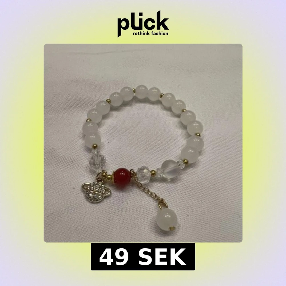 Säljer fyra unika armband med pärlor i olika färger och berlocker. Det första armbandet har vita pärlor med en röd accent och en glittrig berlock. Det andra har blågröna pärlor med en guldfärgad berlock. Det tredje armbandet är lila med en hjärtformad berlock. Det fjärde har pastellfärgade pärlor och en hjärtformad berlock.