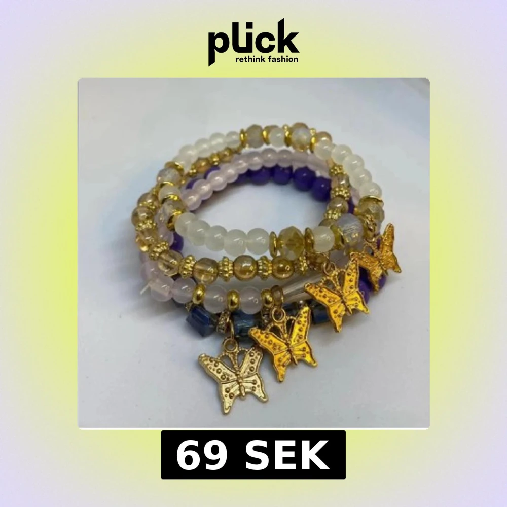 Snygga armband med pärlor i vitt, guld, lila och transparent, dekorerade med detaljerade guldfärgade fjärilsberlocker. Armbanden har elastisk tråd och mixade pärlor i olika former och storlekar för en trendig look. Ej använd utan kommer från min small business.