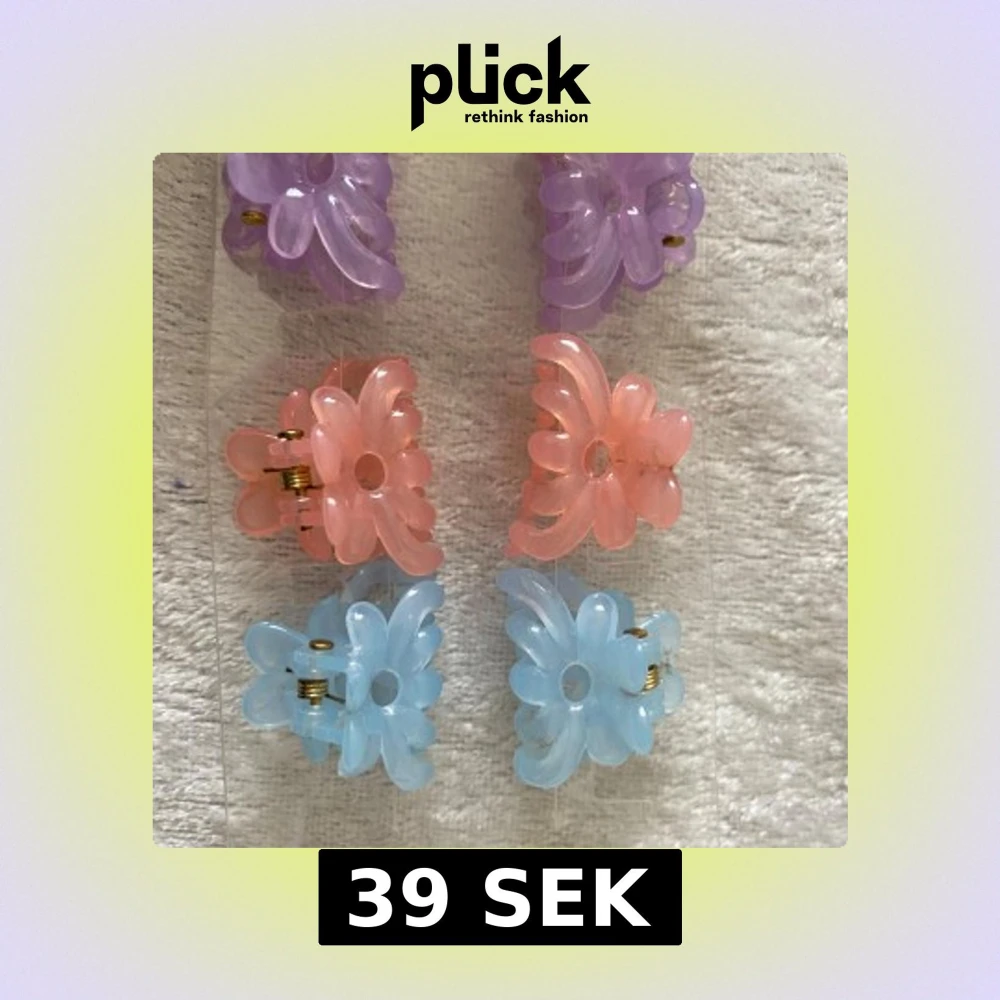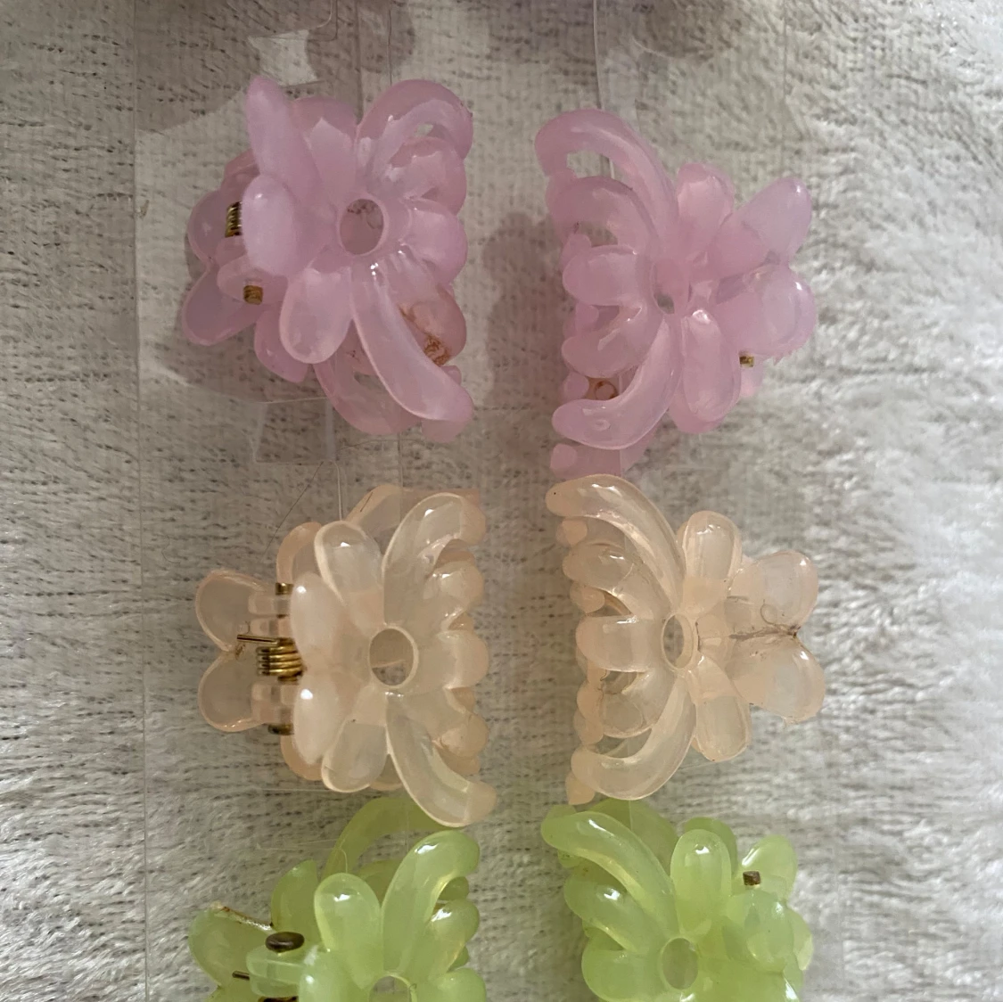 Säljer ett set med åtta blommiga hårklämmor i pastellfärger: lila, rosa, blå, grön och beige. Klämmorna har en söt blomform och är gjorda i plast med metallfjäder. Perfekta för att piffa upp frisyren med en lekfull och trendig touch. Pris 39kr/3 par /bild