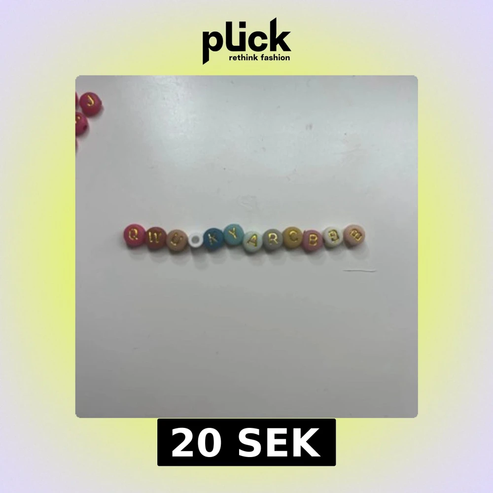 Säljer en ask med runda bokstavspärlor i olika färger som rosa, blå, vit, beige och gul. Pärlorna har bokstäver i guld och är perfekta för att göra egna armband, halsband eller andra smycken. Kommer i en smidig plastask.