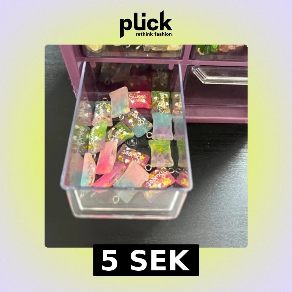 Säljer flera rektangulära hängsmycken i olika färger som rosa, grön, blå och röd. Smyckena har texten 'Sweet' och små blommor inuti, perfekta att använda till egna smyckesprojekt eller som berlocker.🤍