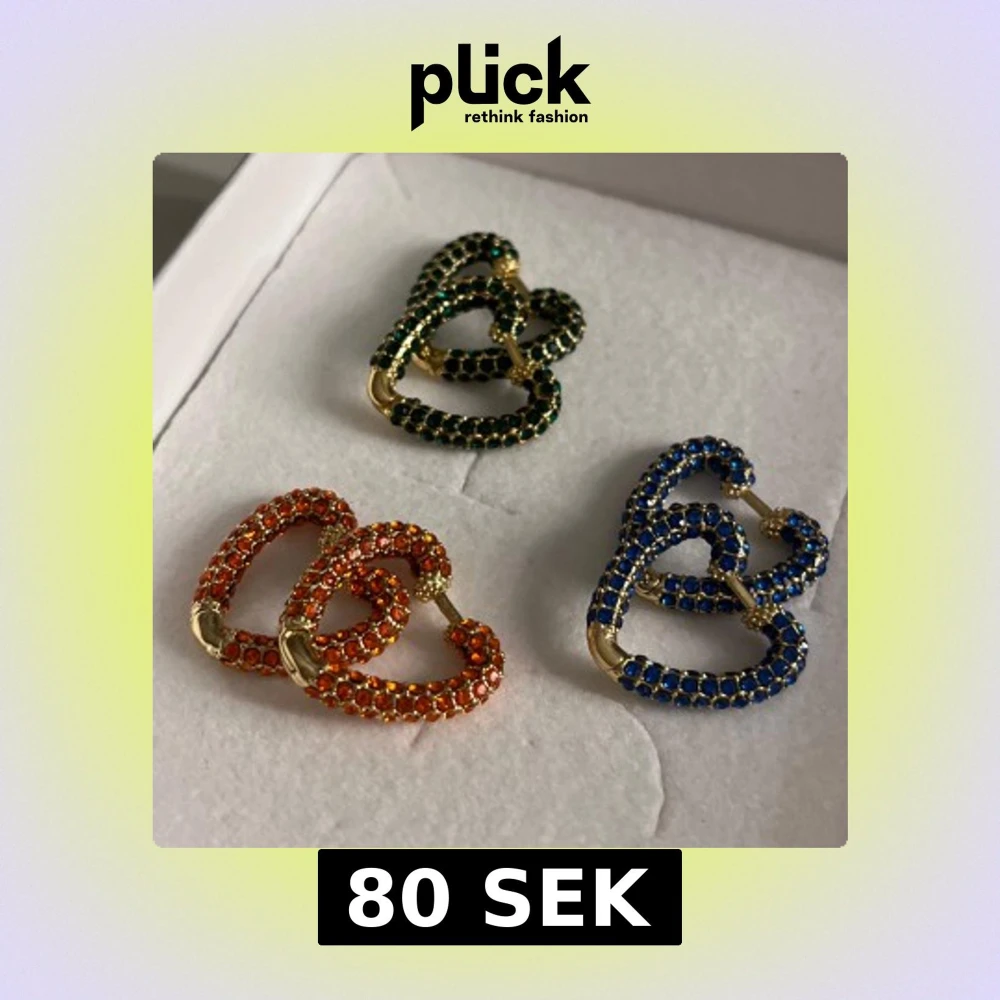 Säljer tre par hjärtformade örhängen i olika färger: grönt, blått och orange. Varje par är dekorerat med små glittrande stenar som ger en elegant touch. Perfekta för att lägga till lite färg och stil till din outfit.