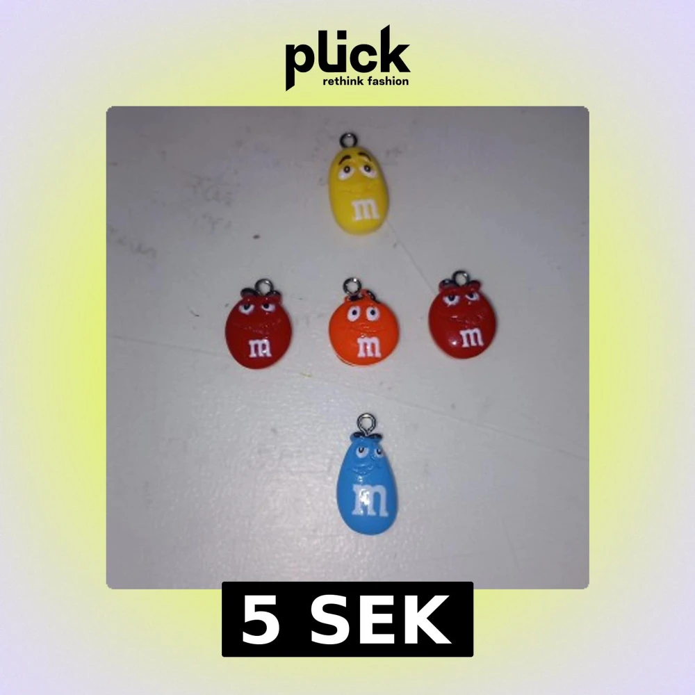 Fem söta berlocker formade som M&M-figurer i färgerna gul, blå, orange och röd. Perfekta att använda som hängen till halsband, armband eller örhängen. Varje berlock har ett litet ögla för enkel fastsättning och detaljerade ansikten.