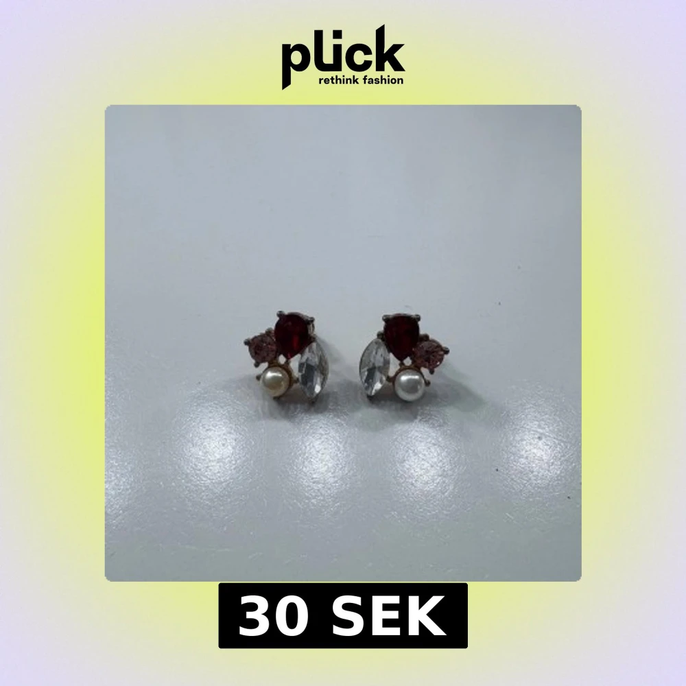 Säljer ett par örhängen med röda, rosa och klara stenar samt vita pärlor. Örhängena har en mix av former och ger ett unikt och trendigt intryck. Perfekta för att lyfta din stil!