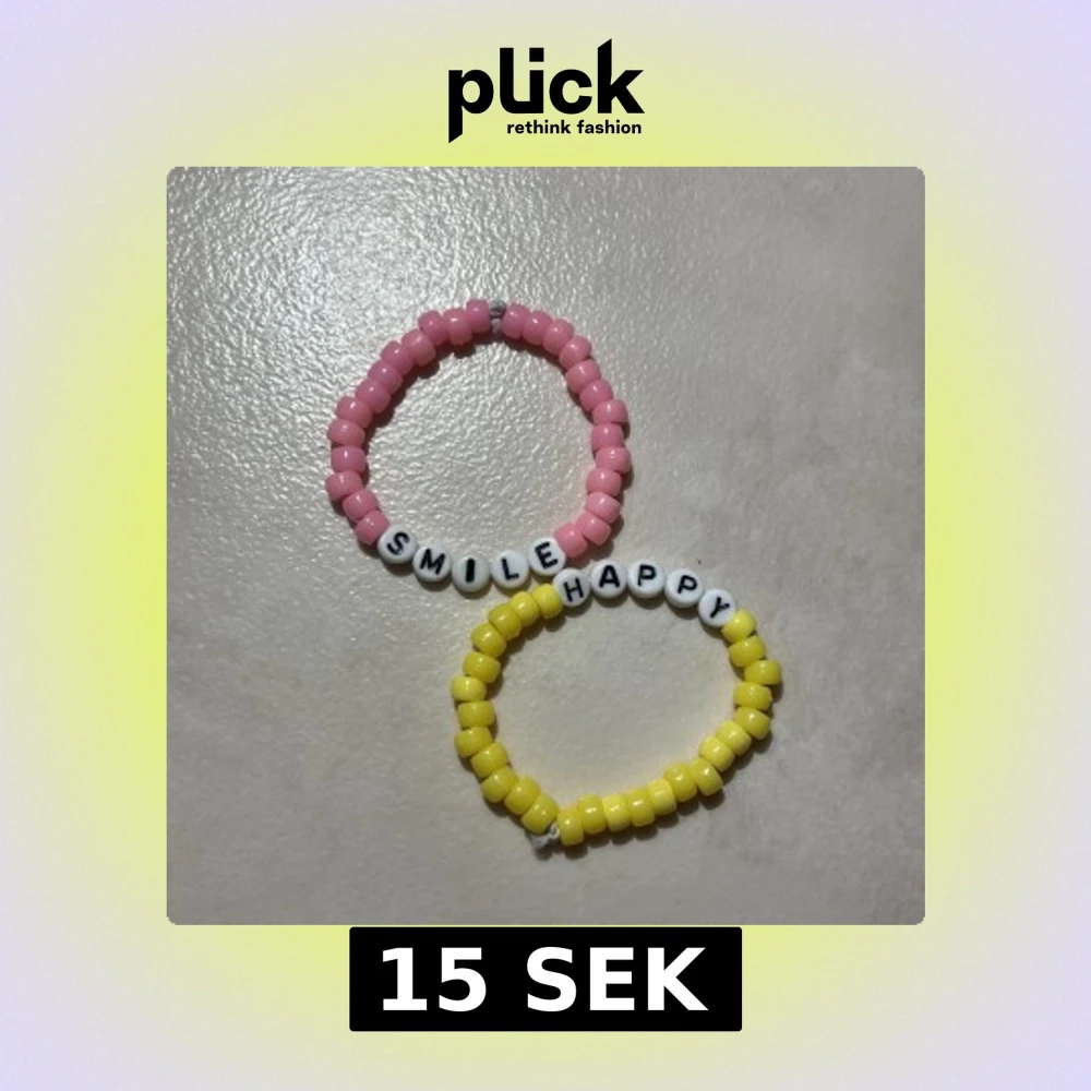 Två söta armband med plastpärlor, ett i rosa med texten SMILE och ett i gult med texten HAPPY. Pärlorna är runda och vita bokstavspärlor ger en lekfull vibe. Perfekt accessoar för att sprida good vibes och färg till din outfit.