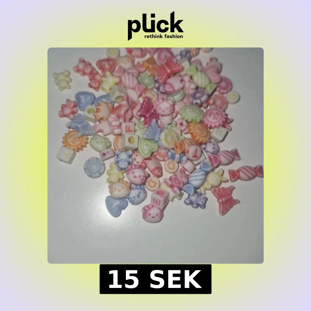 Säljer ett mixat paket med söta pärlor i olika former som fjärilar, hjärtan, Hello Kitty, blommor och godisar. Pärlorna är i pastellfärger som rosa, blå, lila, grön, gul och orange. Perfekt för att göra egna armband, halsband eller örhängen. Kommer i en zip-påse.