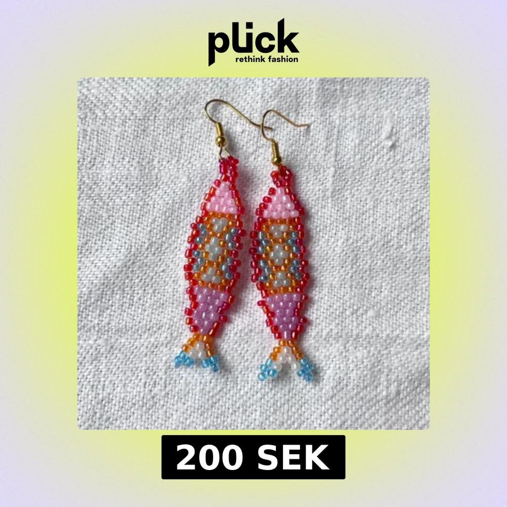 Unika örhängen i form av fiskar, handgjorda av mig med metoden ”brickbeading” av små pärlor i rosa, rött, orange, blått och vitt. Perfekt till sommaren!
