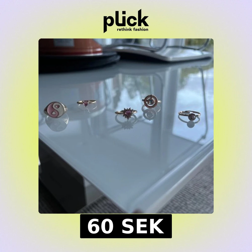 Säljer ett set med trendiga ringar i guldton med detaljer i rosa, vitt och lila. Ringarna har olika former som hjärta, yin-yang, pärlor och stenar. Perfekt för dig som gillar att mixa och matcha smycken med unika former och färger. Helt nya, mycket bra. 11 st, 5 st är justerbara.