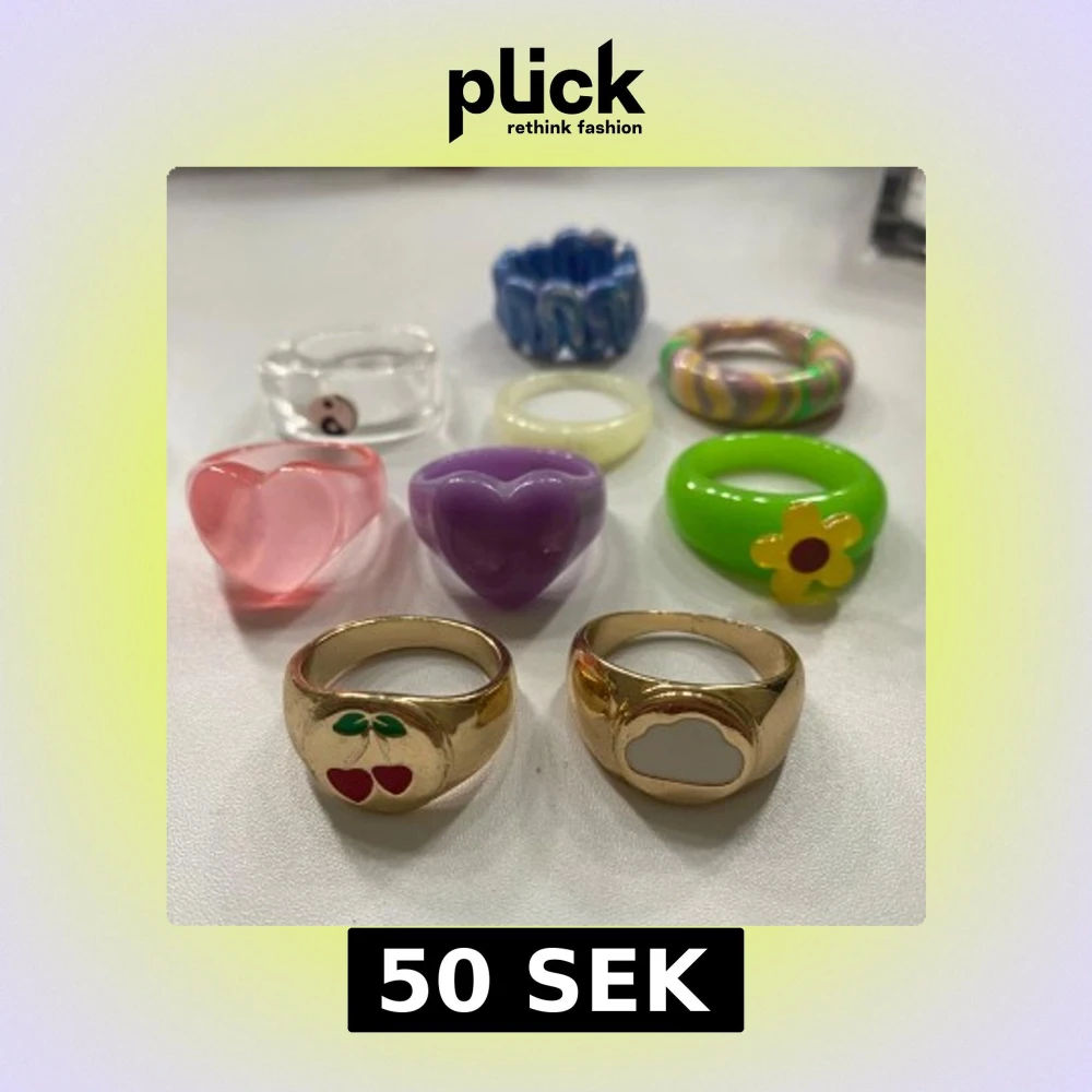 Säljer ett set med åtta unika ringar i olika färger och former. Inkluderar två guldiga ringar med körsbär och moln, samt färgglada plast- och akrylringar i hjärt- och blomform. Perfekt för att mixa och matcha!