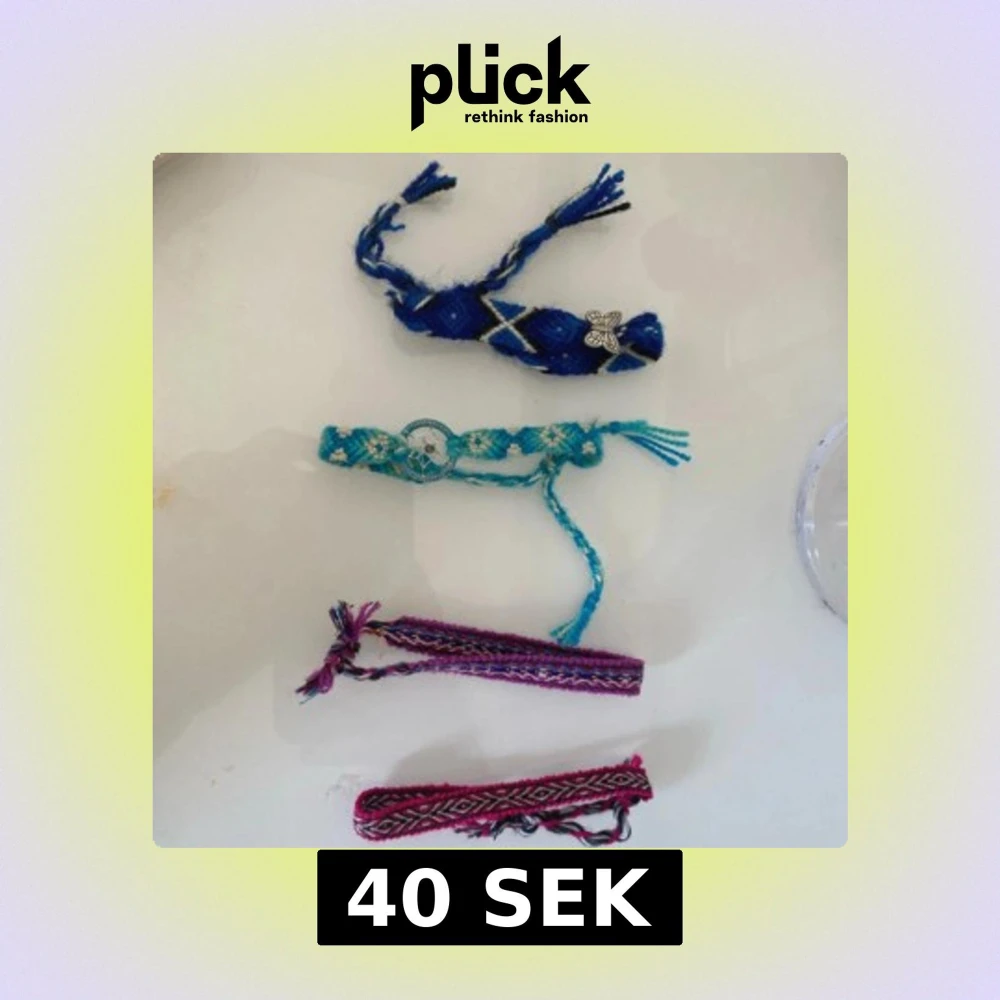 Fyra handgjorda vänskapsarmband i olika färger och mönster. Ett blått med silverfärgad blomdetalj, ett turkost med drömfångare, ett lila och ett rosa med vävt mönster. Perfekta som accessoar för att ge din stil en personlig touch.