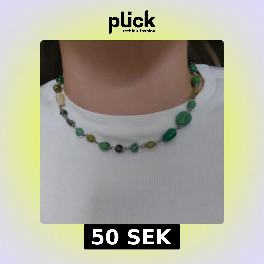 Säljer ett unikt halsband med pärlor i olika gröna och gula nyanser. Halsbandet har en dekorativ låsdetalj och är perfekt för att ge en färgklick till din outfit. 🌹