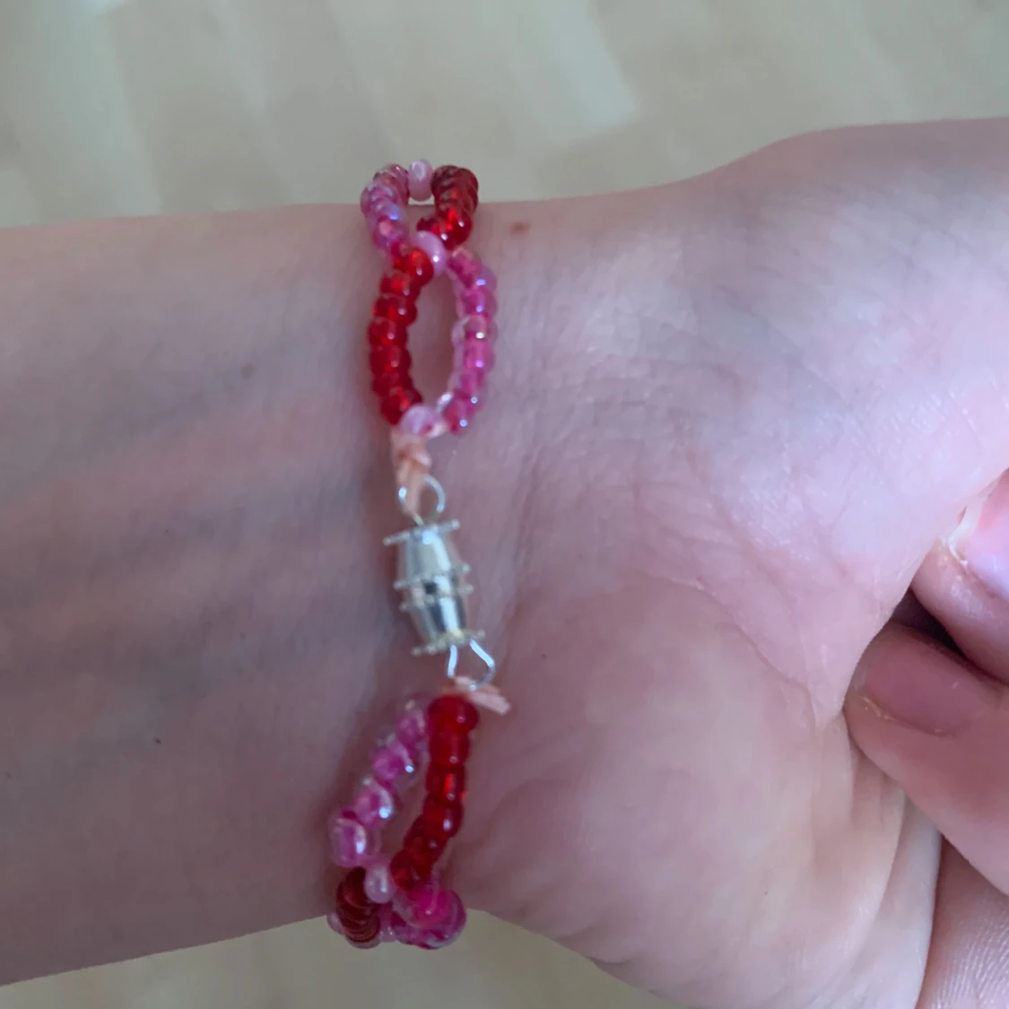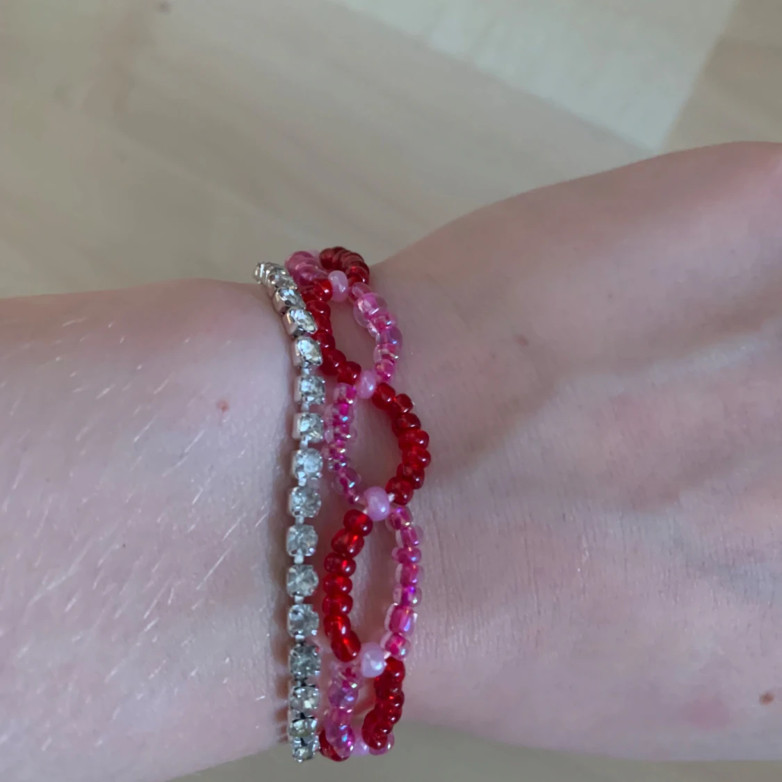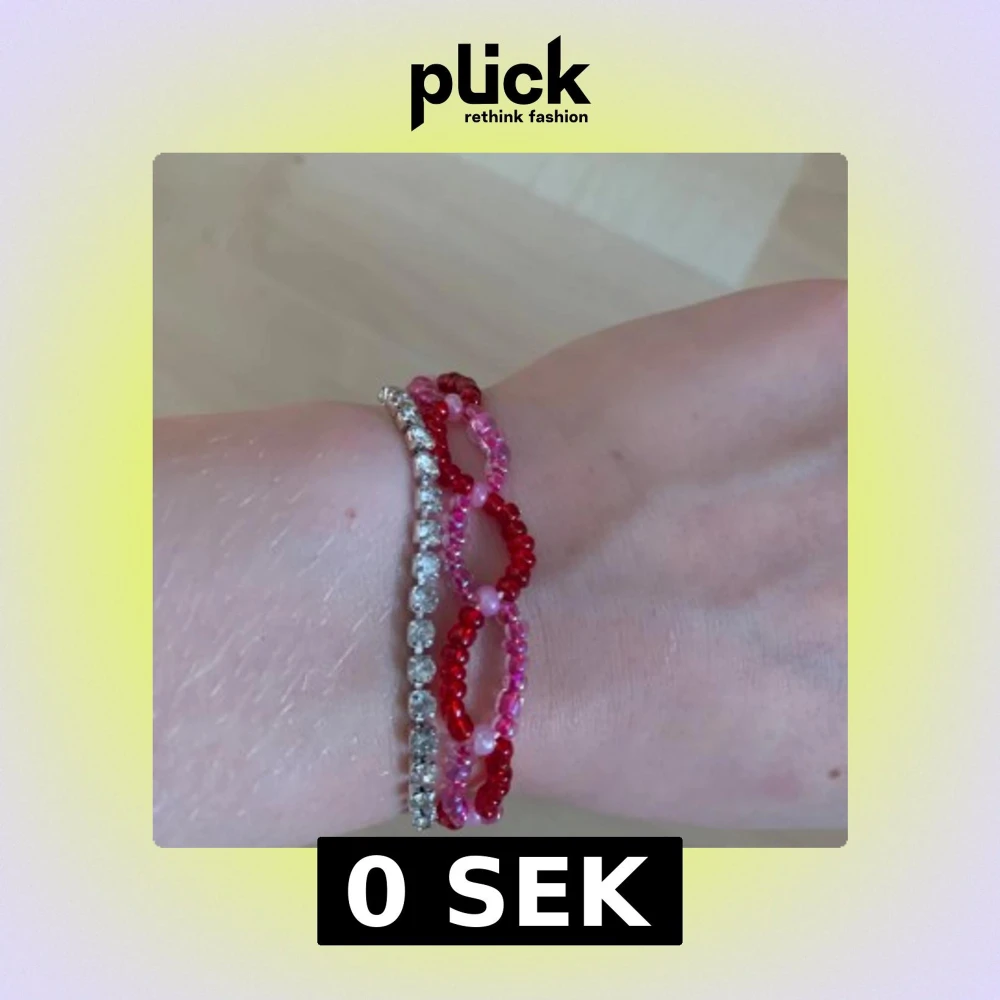 Säljer ett färgglatt armband med pärlor i rött och rosa. Armbandet har en unik design med flera rader av pärlor och ett smidigt lås. Perfekt för att ge en färgklick till din outfit! Kostar 15kr