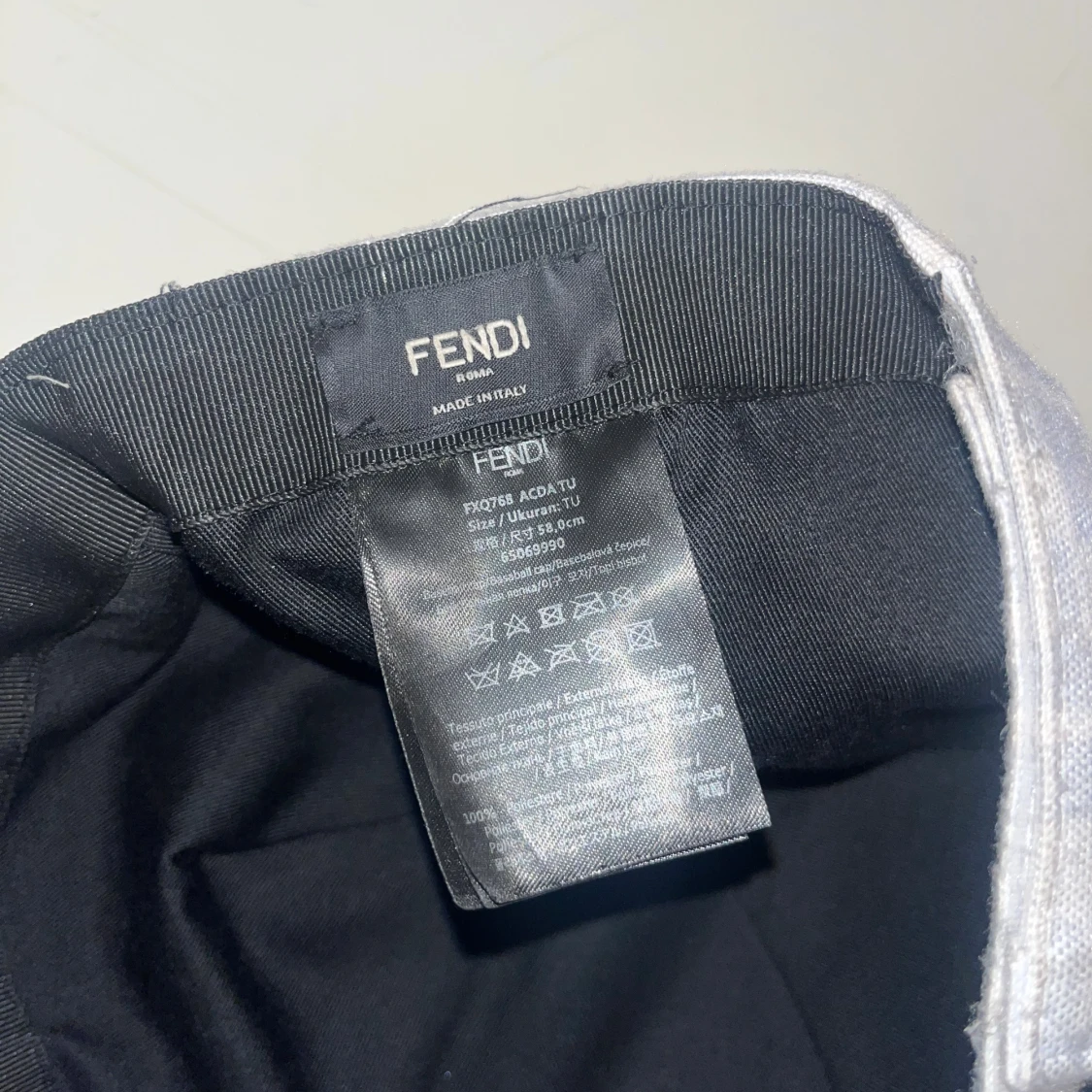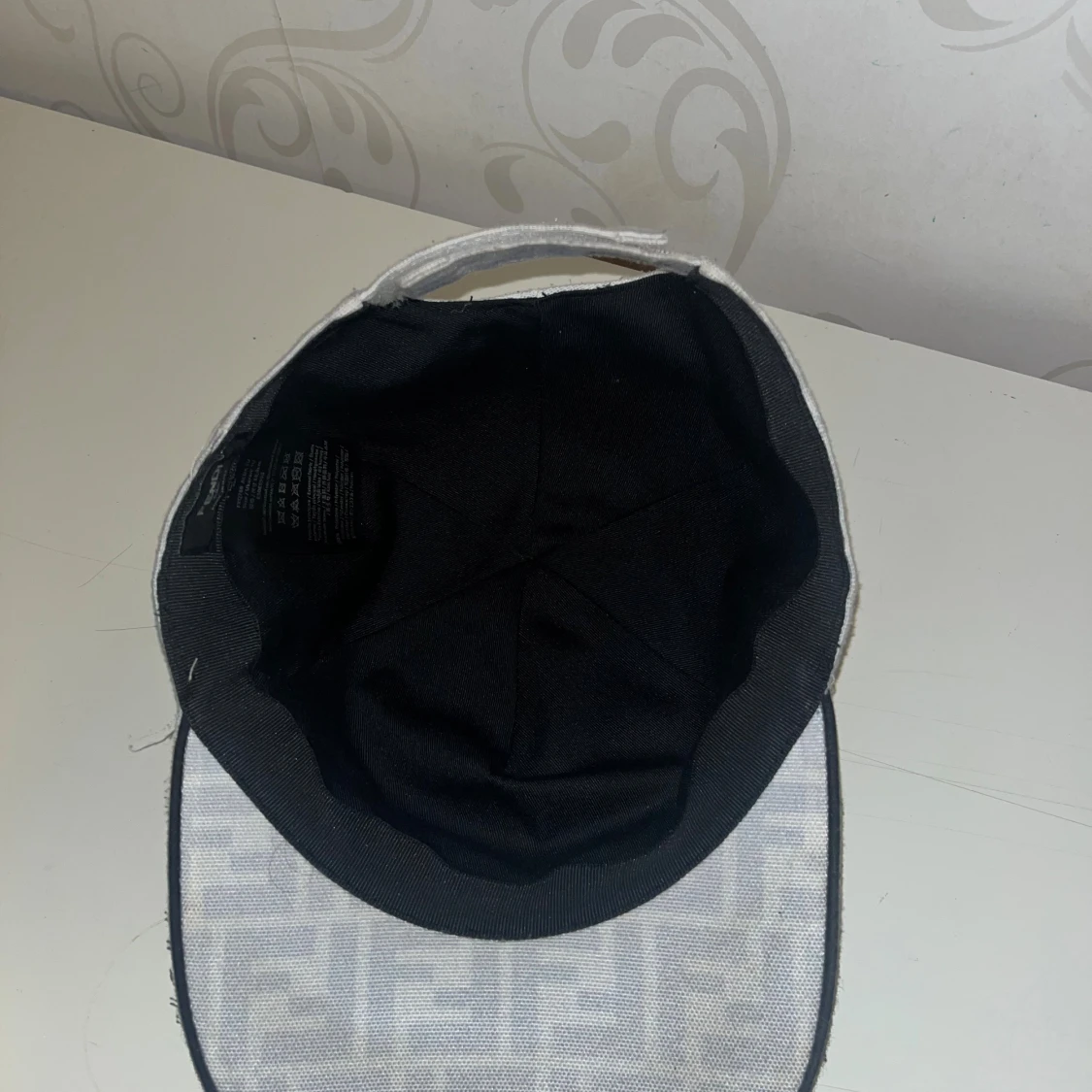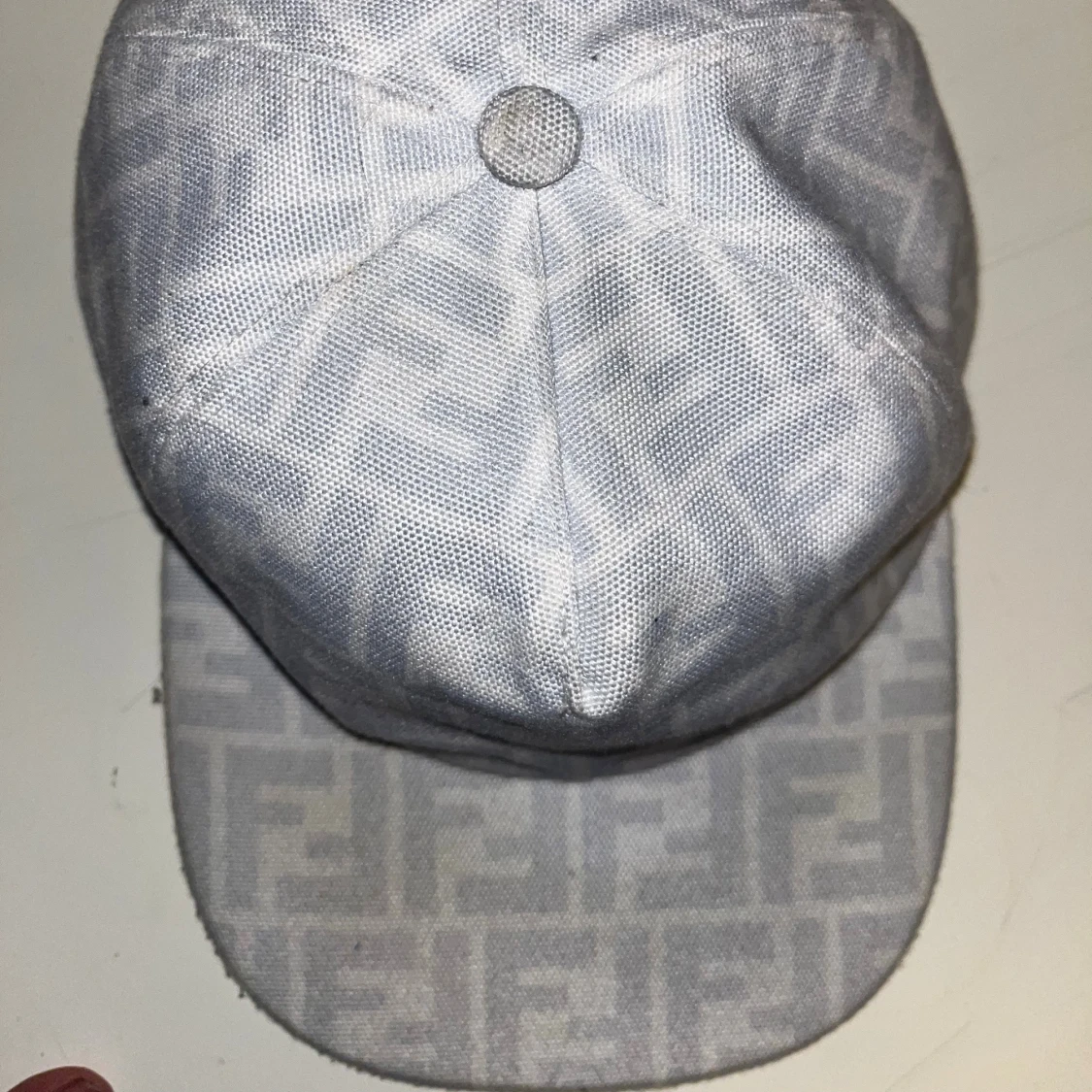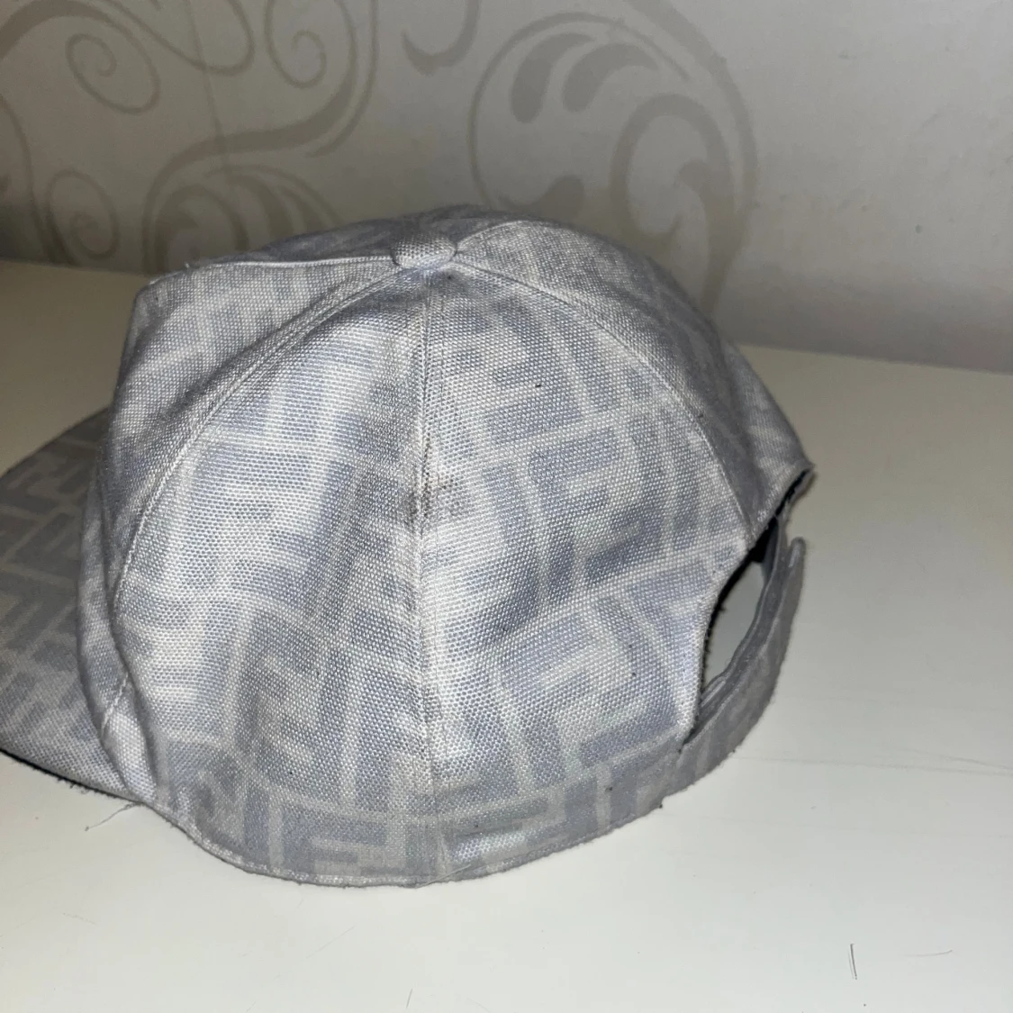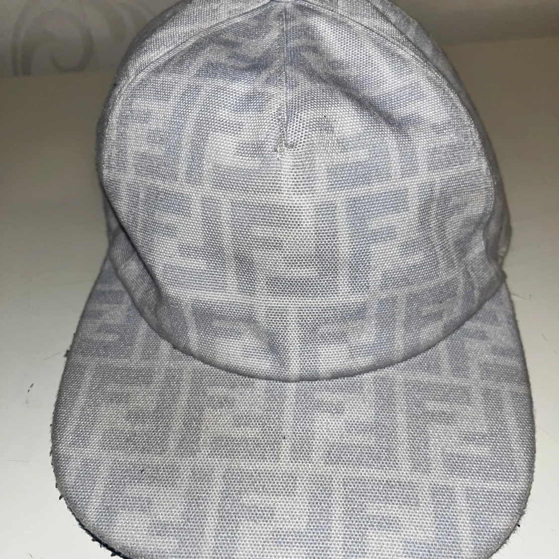 Säljer en snygg keps från Fendi i ljusgrått med det klassiska FF-logomönstret över hela kepsen. Kepsen är tillverkad i bomull och har justerbar rem baktill. Perfekt accessoar för att lyfta din outfit med en exklusiv touch.
