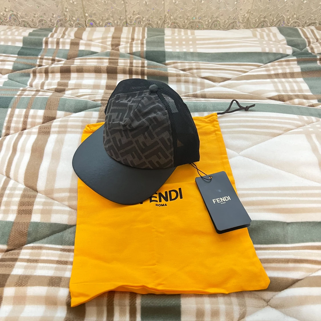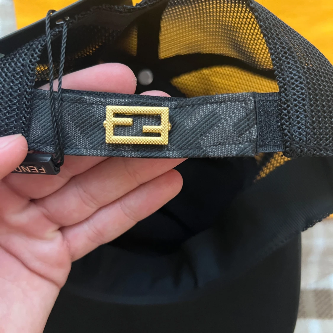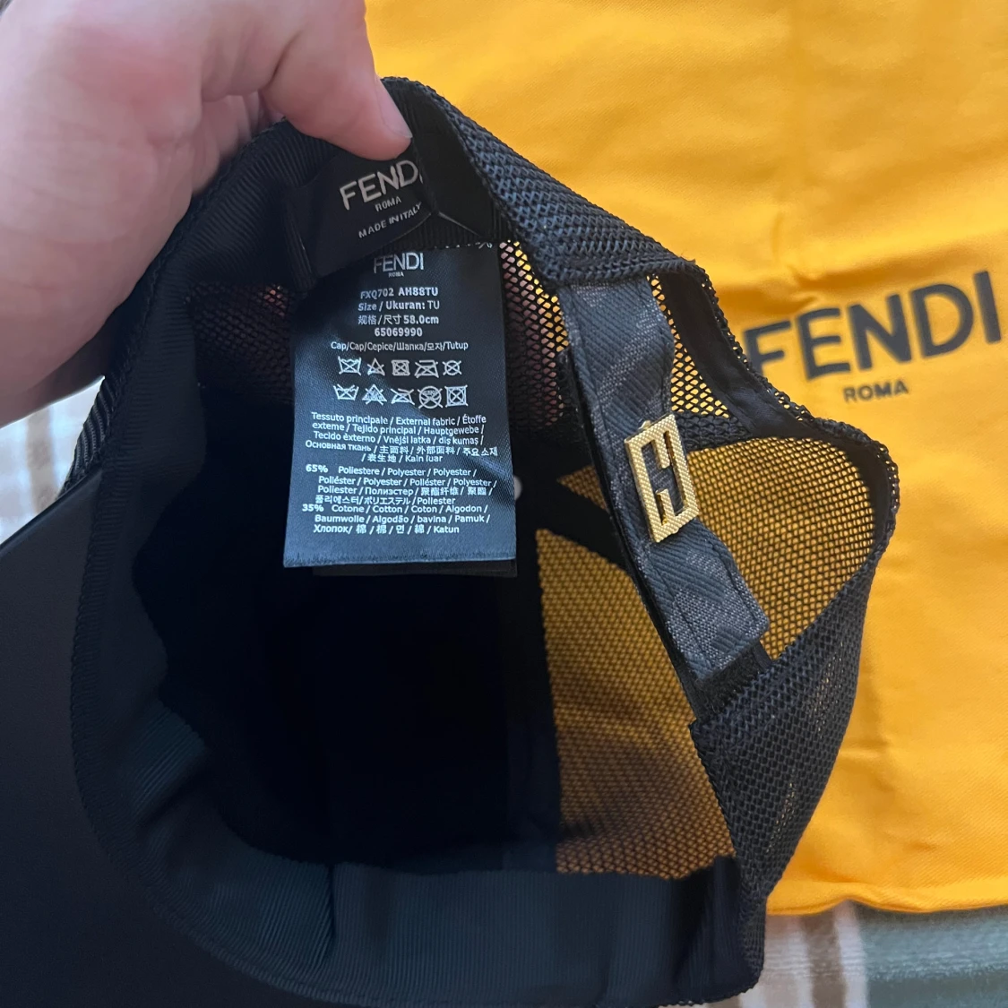 Snygg svart keps från Fendi med klassiskt FF-mönster på framsidan och mesh på sidorna för extra ventilation. Justerbar rem med guldfärgad Fendi-logga bak. Tillverkad i polyester och bomull. Perfekt för dig som vill ha en exklusiv streetstyle-accessoar. Storlek 58cm (S)