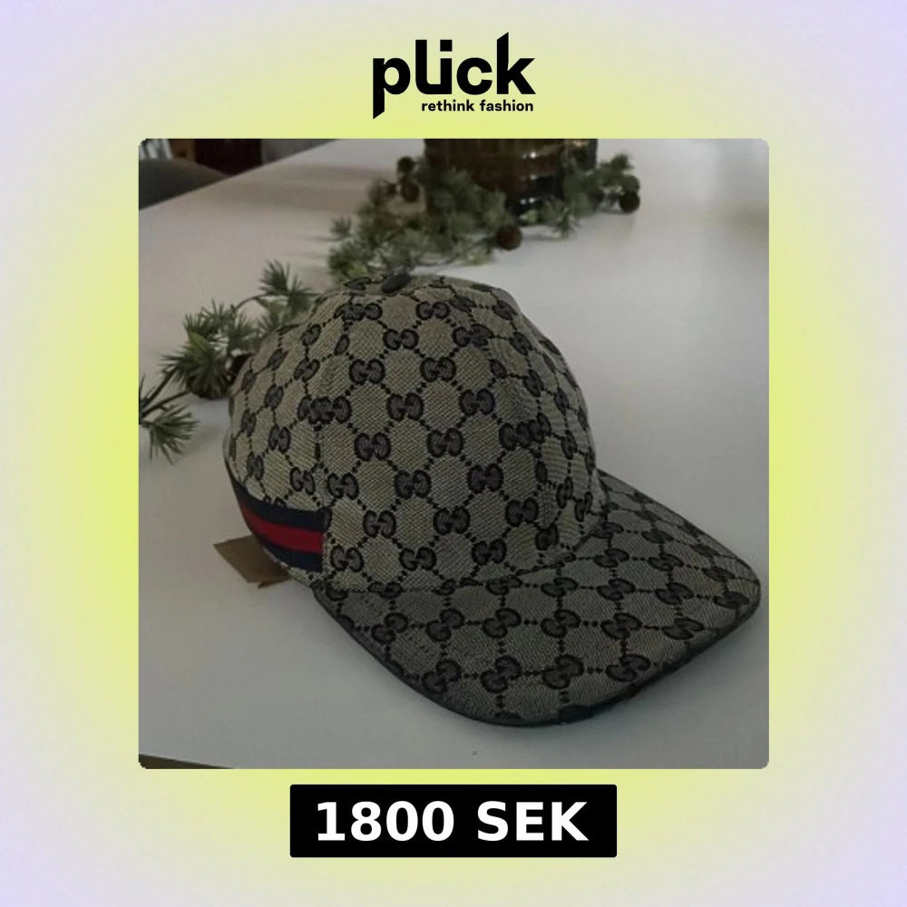 Snygg keps från Gucci med det ikoniska GG-mönstret i beige och svart. Kepsen har en justerbar rem baktill och en röd och blå randdetalj på sidan. Kepsen luktar lite ciggareter